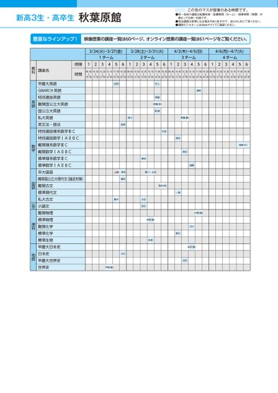 新高3生・高卒生●同一名称の講座は設置校舎・設置期間(ターム)・授業時間(時限)が異なっても同一内容です。●担当講師は変更になる場合がありますので、あらかじめご了承ください。●講師のフルネームはWebサイトでご確認ください。この色のマスが授業のある時限です。3/24(火)~3/27(金)3/28(土)~3/31(火)4/2(木)~4/5(日)4/6(月)~4/7(火)1ターム2ターム3ターム4ターム12345612345612345612345609:0010:5013:2015:1017:0018:5009:0010:5013:2015:1017:0018:5009:0010:5013:2015:1017:0018:5009:0010:5013:2015:1017:0018:5010:3012:2014:5016:4018:3020:2010:3012:2014:5016:4018:3020:2010:3012:2014:5016:4018:3020:2010:3012:2014:5016:4018:3020:20高梨(大)土岐田川成岩間山崎・隼坂篠原内鹿大内平尾(雅)村上奥脇髙橋(保)森(博)濱崎橋高(勝)生田渡辺渡辺遠藤酒井(完)一瀬菊川中野(健)古川坂本(勝)沼田島田菊川・太田田太宮元中野(喜)牧島時限時間講座名教科早慶大英語GMARCH英語特別選抜英語難関国公立大英語国公立大英語私大英語英文法・語法特別選抜理系数学ⅢC特別選抜数学ⅠAⅡBC難関理系数学ⅢC難関数学ⅠAⅡBC標準理系数学ⅢC標準数学ⅠAⅡBC早大国語難関国公立大現代文(論述対策)難関古文標準現代文私大古文小論文難関物理標準物理難関化学標準化学標準生物早慶大日本史日本史早慶大世界史世界史英語数学国語小論文理科地歴秋葉原館●2026年度/春期講習/東日本/秋葉原/高3・卒生/パターン14452026_58_3_368_11_20251106165356.csv/1ページ校了時削除