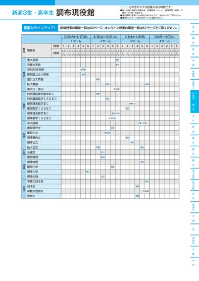 新高3生・高卒生●同一名称の講座は設置校舎・設置期間(ターム)・授業時間(時限)が異なっても同一内容です。●担当講師は変更になる場合がありますので、あらかじめご了承ください。●講師のフルネームはWebサイトでご確認ください。この色のマスが授業のある時限です。本郷麹町新宿池袋秋葉原自由が丘吉祥寺調布立川町田厚木藤沢横浜あざみ野金沢文庫大宮南浦和川越柏津田沼千葉水戸3/24(火)~3/27(金)3/28(土)~3/31(火)4/2(木)~4/5(日)4/6(月)~4/7(火)1ターム2ターム3ターム4ターム12345612345612345612345609:0010:5013:2015:1017:0018:5009:0010:5013:2015:1017:0018:5009:0010:5013:2015:1017:0018:5009:0010:5013:2015:1017:0018:5010:3012:2014:5016:4018:3020:2010:3012:2014:5016:4018:3020:2010:3012:2014:5016:4018:3020:2010:3012:2014:5016:4018:3020:20吉川(量)吉田香川内山(洋)栗原長野青木秋山佐々木(夫)佐々木(夫)川野酒井(完)賀平正上長谷川山川西尾菊川高梨(大)流川森永税田土岐田大窪・太田川貴宇都西川平尾(雅)安部大瀧時限時間講座名教科東大英語早慶大英語GMARCH英語難関国公立大英語国公立大英語私大英語英文法・語法特別選抜理系数学ⅢC特別選抜数学ⅠAⅡBC難関理系数学ⅢC難関数学ⅠAⅡBC標準理系数学ⅢC標準数学ⅠAⅡBC早大国語難関現代文難関古文標準現代文標準古文私大古文小論文難関物理標準物理難関化学標準化学標準生物早慶大日本史日本史早慶大世界史世界史英語数学国語小論文理科地歴調布現役館●2026年度/春期講習/東日本/調布/高3・卒生/パターン14452026_58_3_367_11_20251106165356.csv/1ページ校了時削除
