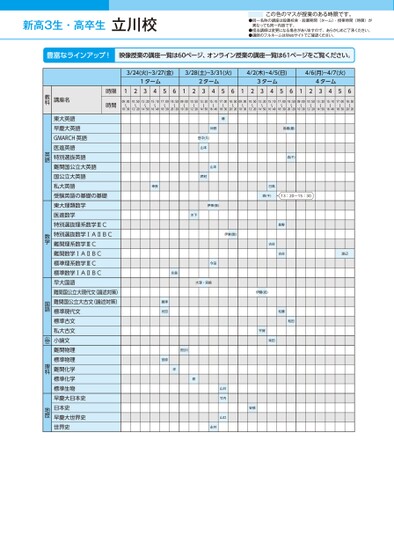 新高3生・高卒生●同一名称の講座は設置校舎・設置期間(ターム)・授業時間(時限)が異なっても同一内容です。●担当講師は変更になる場合がありますので、あらかじめご了承ください。●講師のフルネームはWebサイトでご確認ください。この色のマスが授業のある時限です。3/24(火)~3/27(金)3/28(土)~3/31(火)4/2(木)~4/5(日)4/6(月)~4/7(火)1ターム2ターム3ターム4ターム12345612345612345612345609:0010:5013:2015:1017:0018:5009:0010:5013:2015:1017:0018:5009:0010:5013:2015:1017:0018:5009:0010:5013:2015:1017:0018:5010:3012:2014:5016:4018:3020:2010:3012:2014:5016:4018:3020:2010:3012:2014:5016:4018:3020:2010:3012:2014:5016:4018:3020:20墺野仲田中(久)山本山本橋髙(慶)森(千)幸長日髙森(千)13:20~15:30伊東(敦)木下伊東(敦)永島今田大窪・宮崎藤澤光田長谷川宮原沖原長野谷古古谷伊藤(武)平賀柴田松藤和田山川竹内山口永井安部辺渡時限時間講座名教科東大英語早慶大英語GMARCH英語医進英語特別選抜英語難関国公立大英語国公立大英語私大英語受験英語の基礎の基礎東大理類数学医進数学特別選抜理系数学ⅢC特別選抜数学ⅠAⅡBC難関理系数学ⅢC難関数学ⅠAⅡBC標準理系数学ⅢC標準数学ⅠAⅡBC早大国語難関国公立大現代文(論述対策)難関国公立大古文(論述対策)標準現代文標準古文私大古文小論文難関物理標準物理難関化学標準化学標準生物早慶大日本史日本史早慶大世界史世界史英語数学国語小論文理科地歴立川校●2026年度/春期講習/東日本/立川/高3・卒生/パターン14452026_58_3_315_11_20251106165356.csv/1ページ校了時削除