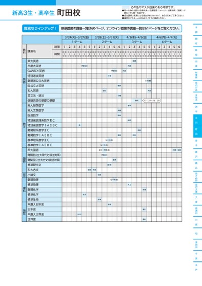 新高3生・高卒生●同一名称の講座は設置校舎・設置期間(ターム)・授業時間(時限)が異なっても同一内容です。●担当講師は変更になる場合がありますので、あらかじめご了承ください。●講師のフルネームはWebサイトでご確認ください。この色のマスが授業のある時限です。本郷麹町新宿池袋秋葉原自由が丘吉祥寺調布立川町田厚木藤沢横浜あざみ野金沢文庫大宮南浦和川越柏津田沼千葉水戸3/24(火)~3/27(金)3/28(土)~3/31(火)4/2(木)~4/5(日)4/6(月)~4/7(火)1ターム2ターム3ターム4ターム12345612345612345612345609:0010:5013:2015:1017:0018:5009:0010:5013:2015:1017:0018:5009:0010:5013:2015:1017:0018:5009:0010:5013:2015:1017:0018:5010:3012:2014:5016:4018:3020:2010:3012:2014:5016:4018:3020:2010:3012:2014:5016:4018:3020:2010:3012:2014:5016:4018:3020:20伊藤(直)遠藤天倉伊藤(宏)天倉久地木村(麟)島大鏑木13:20~15:30舩岩礒貝中園吉崎板谷香坂依田堺依田富田依田佐々木(吾)佐々木(吾)森永・阿部(順)伊藤(武)藤澤喜久里宮崎太田松崎佐々木(哲)井上永井佐々木牧島安部安達黒川桐山兵頭・宮崎時限時間講座名教科東大英語早慶大英語GMARCH英語特別選抜英語難関国公立大英語国公立大英語私大英語英文法・語法受験英語の基礎の基礎東大理類数学東大文類数学医進数学特別選抜理系数学ⅢC特別選抜数学ⅠAⅡBC難関理系数学ⅢC難関数学ⅠAⅡBC標準理系数学ⅢC標準数学ⅠAⅡBC早大国語難関国公立大現代文(論述対策)難関国公立大古文(論述対策)標準現代文私大古文小論文難関物理標準物理難関化学標準化学標準生物早慶大日本史日本史早慶大世界史世界史英語数学国語小論文理科地歴町田校●2026年度/春期講習/東日本/町田/高3・卒生/パターン14452026_58_3_325_11_20251106165356.csv/1ページ校了時削除