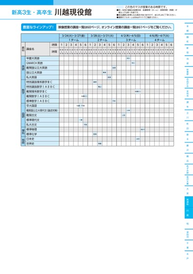 新高3生・高卒生●同一名称の講座は設置校舎・設置期間(ターム)・授業時間(時限)が異なっても同一内容です。●担当講師は変更になる場合がありますので、あらかじめご了承ください。●講師のフルネームはWebサイトでご確認ください。この色のマスが授業のある時限です。本郷麹町新宿池袋秋葉原自由が丘吉祥寺調布立川町田厚木藤沢横浜あざみ野金沢文庫大宮南浦和川越柏津田沼千葉水戸3/24(火)~3/27(金)3/28(土)~3/31(火)4/2(木)~4/5(日)4/6(月)~4/7(火)1ターム2ターム3ターム4ターム12345612345612345612345609:00〜10:3010:50〜12:2013:20〜14:5015:10〜16:4017:00〜18:3018:50〜20:2009:00〜10:3010:50〜12:2013:20〜14:5015:10〜16:4017:00〜18:3018:50〜20:2009:00〜10:3010:50〜12:2013:20〜14:5015:10〜16:4017:00〜18:3018:50〜20:2009:00〜10:3010:50〜12:2013:20〜14:5015:10〜16:4017:00〜18:3018:50〜20:20早川早川金城栗原金城秦野亀山佐藤(仁)松藤・平賀一瀬平賀西尾斉藤河本小林上田佐藤(仁)長谷川太田講座名時限時間早慶大英語GMARCH英語難関国公立大英語国公立大英語私大英語特別選抜理系数学ⅢC特別選抜数学ⅠAⅡBC難関理系数学ⅢC難関数学ⅠAⅡBC標準数学ⅠAⅡBC早大国語難関国公立大現代文(論述対策)難関古文標準現代文私大古文標準物理標準化学日本史世界史教科英語数学国語理科地歴川越現役館●2026年度/春期講習/東日本/川越/高3・卒生/パターン14452026_58_3_333_11_20251106165356.csv/1ページ校了時削除