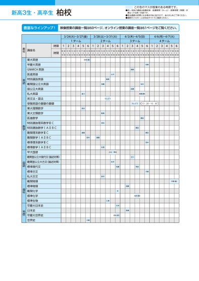 新高3生・高卒生●同一名称の講座は設置校舎・設置期間(ターム)・授業時間(時限)が異なっても同一内容です。●担当講師は変更になる場合がありますので、あらかじめご了承ください。●講師のフルネームはWebサイトでご確認ください。この色のマスが授業のある時限です。3/24(火)~3/27(金)3/28(土)~3/31(火)4/2(木)~4/5(日)4/6(月)~4/7(火)1ターム2ターム3ターム4ターム12345612345612345612345609:00〜10:3010:50〜12:2013:20〜14:5015:10〜16:4017:00〜18:3018:50〜20:2009:00〜10:3010:50〜12:2013:20〜14:5015:10〜16:4017:00〜18:3018:50〜20:2009:00〜10:3010:50〜12:2013:20〜14:5015:10〜16:4017:00〜18:3018:50〜20:2009:00〜10:3010:50〜12:2013:20〜14:5015:10〜16:4017:00〜18:3018:50〜20:20田村(喜)成川宮本遠藤宮本遠藤加藤飯島成合永島田中小嶋山川篠原えんどう濱崎加藤仲野松本高橋(勝)えんどう13:20~15:30郷田郷田郷田宮本川崎小池・隼坂佐河立川松藤荒田向井(勇)加藤髙橋三浦沖大内坂本(新)中野(喜)時限時間講座名教科東大英語早慶大英語GMARCH英語医進英語特別選抜英語難関国公立大英語国公立大英語私大英語英文法・語法受験英語の基礎の基礎東大理類数学東大文類数学医進数学特別選抜理系数学ⅢC特別選抜数学ⅠAⅡBC難関理系数学ⅢC難関数学ⅠAⅡBC標準理系数学ⅢC標準数学ⅠAⅡBC早大国語難関国公立大現代文(論述対策)難関国公立大古文(論述対策)標準現代文標準古文私大古文難関物理標準物理難関化学標準化学標準生物早慶大日本史日本史早慶大世界史世界史英語数学国語理科地歴柏校●2026年度/春期講習/東日本/柏/高3・卒生/パターン14452026_58_3_322_11_20251106165356.csv/1ページ校了時削除