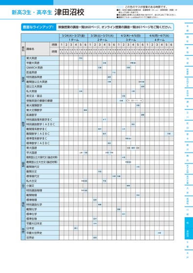 新高3生・高卒生●同一名称の講座は設置校舎・設置期間(ターム)・授業時間(時限)が異なっても同一内容です。●担当講師は変更になる場合がありますので、あらかじめご了承ください。●講師のフルネームはWebサイトでご確認ください。この色のマスが授業のある時限です。本郷麹町新宿池袋秋葉原自由が丘吉祥寺調布立川町田厚木藤沢横浜あざみ野金沢文庫大宮南浦和川越柏津田沼千葉水戸3/24(火)~3/27(金)3/28(土)~3/31(火)4/2(木)~4/5(日)4/6(月)~4/7(火)1ターム2ターム3ターム4ターム12345612345612345612345609:0010:5013:2015:1017:0018:5009:0010:5013:2015:1017:0018:5009:0010:5013:2015:1017:0018:5009:0010:5013:2015:1017:0018:5010:3012:2014:5016:4018:3020:2010:3012:2014:5016:4018:3020:2010:3012:2014:5016:4018:3020:2010:3012:2014:5016:4018:3020:20時限時間講座名教科天野大野丹羽髙日飯島嵐近橋石藤伊(直)野仲小山新野橋石木下柳沢沢柳村田(喜)岩間野久日髙石橋9:00~11:10天野遠藤宮本木三高梨(由)成合大窪・藤澤・宮本崎川・崎山賀平・頭兵中西兵頭松藤阿部(順)平賀鈴木(誠)大窪阿部(誠)陣野小宮合田宮原樹葉田中大内髙岡黒川西尾古川東大英語早慶大英語GMARCH英語医進英語特別選抜英語難関国公立大英語国公立大英語私大英語英文法・語法受験英語の基礎の基礎東大理類数学東大文類数学医進数学特別選抜理系数学ⅢC特別選抜数学ⅠAⅡBC難関理系数学ⅢC難関数学ⅠAⅡBC標準理系数学ⅢC標準数学ⅠAⅡBC東大国語早大国語難関国公立大現代文(論述対策)難関国公立大古文(論述対策)難関現代文難関古文標準現代文私大古文小論文特別選抜物理難関物理標準物理特別選抜化学難関化学標準化学標準生物早慶大日本史日本史早慶大世界史世界史英語数学国語小論文理科地歴津田沼校●2026年度/春期講習/東日本/津田沼/高3・卒生/パターン14452026_58_3_327_11_20251106165356.csv/1ページ校了時削除