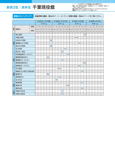 新高3生・高卒生●同一名称の講座は設置校舎・設置期間(ターム)・授業時間(時限)が異なっても同一内容です。●担当講師は変更になる場合がありますので、あらかじめご了承ください。●講師のフルネームはWebサイトでご確認ください。この色のマスが授業のある時限です。3/24(火)~3/27(金)3/28(土)~3/31(火)4/2(木)~4/5(日)4/6(月)~4/7(火)1ターム2ターム3ターム4ターム12345612345612345612345609:00〜10:3010:50〜12:2013:20〜14:5015:10〜16:4017:00〜18:3018:50〜20:2009:00〜10:3010:50〜12:2013:20〜14:5015:10〜16:4017:00〜18:3018:50〜20:2009:00〜10:3010:50〜12:2013:20〜14:5015:10〜16:4017:00〜18:3018:50〜20:2009:00〜10:3010:50〜12:2013:20〜14:5015:10〜16:4017:00〜18:3018:50〜20:20久野田村(喜)石橋高梨(由)島田手塚酒井牧島石橋加藤福永阿部(誠)日髙天野日髙天野兵頭・佐河山崎佐河鈴木(翔)大内髙岡時限時間講座名教科東大英語早慶大英語GMARCH英語難関国公立大英語国公立大英語私大英語英文法・語法特別選抜数学ⅠAⅡBC難関理系数学ⅢC難関数学ⅠAⅡBC標準理系数学ⅢC標準数学ⅠAⅡBC早大国語難関国公立大現代文(論述対策)難関古文標準現代文私大古文標準物理標準化学標準生物早慶大日本史早慶大世界史英語数学国語理科地歴千葉現役館●2026年度/春期講習/東日本/千葉/高3・卒生/パターン14452026_58_3_334_11_20251106165356.csv/1ページ校了時削除