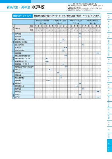 新高3生・高卒生●同一名称の講座は設置校舎・設置期間(ターム)・授業時間(時限)が異なっても同一内容です。●担当講師は変更になる場合がありますので、あらかじめご了承ください。●講師のフルネームはWebサイトでご確認ください。この色のマスが授業のある時限です。本郷麹町新宿池袋秋葉原自由が丘吉祥寺調布立川町田厚木藤沢横浜あざみ野金沢文庫大宮南浦和川越柏津田沼千葉水戸3/24(火)~3/27(金)3/28(土)~3/31(火)4/2(木)~4/5(日)4/6(月)~4/7(火)1ターム2ターム3ターム4ターム12345612345612345612345609:15〜10:4511:05〜12:3513:30〜15:0015:20〜16:5017:10〜18:4019:00〜20:3009:15〜10:4511:05〜12:3513:30〜15:0015:20〜16:5017:10〜18:4019:00〜20:3009:15〜10:4511:05〜12:3513:30〜15:0015:20〜16:5017:10〜18:4019:00〜20:3009:15〜10:4511:05〜12:3513:30〜15:0015:20〜16:5017:10〜18:4019:00〜20:30吉田濱崎吉川(量)石川佐藤(健)渡辺森下荒田上田小野亀山中村(隆)中佐々木(哲)村山川東内宮原安東白石髙橋板谷西尾小嶋時限時間講座名教科東大英語医進英語特別選抜英語難関国公立大英語国公立大英語私大英語英文法・語法医進数学特別選抜理系数学ⅢC特別選抜数学ⅠAⅡBC難関理系数学ⅢC難関数学ⅠAⅡBC難関国公立大現代文(論述対策)難関古文標準現代文標準古文特別選抜物理難関物理標準物理特別選抜化学難関化学標準化学日本史世界史英語数学国語理科地歴水戸校●2026年度/春期講習/東日本/水戸/高3・卒生/パターン14452026_58_3_344_11_20251106165356.csv/1ページ校了時削除