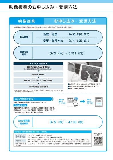 映像授業のお申し込み・受講方法映像授業お申し込み・受講方法*対象講座は時間割冊子またはWebサイトをご覧ください。映像授業はオンライン授業とは異なります。申込期間視聴可能期間新規・追加4/2(木)まで変更・取りやめ3/1(日)まで3/5(木)〜5/31(日)お申し込み・受講方法講座のお申し込みとお支払い他の春期講習の講座と同様にお申し込みください。教材のお受け取り専用サイトにログインし講義を視聴※Webで質問し疑問を解消※視聴方法は、申込マイページの「受講証(時間割)-講習はこちら-」から「受講上のご案内」などをご確認ください。●自分のスケジュールにあわせて受講できます。●わからない部分は繰り返し視聴できます。●自宅での視聴も可能です。Webで質問できる!Webで映像授業の内容に関する質問ができます。Web質問方法下記期間内に、専用サイトにてWebで質問を受け付けます。詳細は申込マイページの「受講証(時間割)-講習はこちら-」から「受講上のご案内」をご確認ください。質問書を撮影しデータ送信カシャ!回答がWebで確認できるWeb質問書提出期間3/5(木)〜4/16(木)対応端末・動作推奨環境(2025年11月現在)タブレット/スマートフォンパソコン【OS:iOS17以降】ブラウザ:Safari【OS:Android13以降】ブラウザ:GoogleChrome【OS:Windows11以上】ブラウザ:GoogleChromeの最新バージョン、MicrosoftEdgeの最新バージョン【OS:MacOSⅩ14.0以降】ブラウザ:Safari最新バージョン、GoogleChromeの最新バージョン※OSの将来バージョン、タブレット/スマートフォンの新機種などの対応は、動作確認が完了次第、推奨環境としてご案内していきます。受講の流れはこちら▼