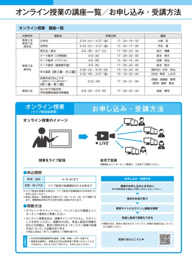 オンライン授業の講座一覧/お申し込み・受講方法オンライン授業講座一覧講座名日本史世界史英文法・語法テーマ数学(三角関数)テーマ数学(ベクトル)テーマ数学(複素数平面)授業日時3/24(火)~3/27(金)3/24(火)~3/27(金)4/6(月)・4/7(火)4/8(水)4/6(月)4/9(木)早大国語【現2講・古2講】3/28(土)・3/29(日)3/26(木)・3/27(金)17:20~18:5015:30~17:0017:00~20:3017:20~20:4013:20~16:4017:20~20:4019:10~20:4019:10~20:403/22(日)17:30~21:00講師小倉匡平松健成川博康森本啓夫佐野哲也森本啓夫(現代文)木村哲也(古文)隼坂しのぶ(英語)胡摩㟢章秀(数学)樋原賢治4/8(水)・4/9(木)17:20~20:40加賀健司お申し込み・受講方法対象学年新高2生新高3生高卒生新高3生高卒生新高3生答案作成力向上ラボ-全国のライバルと高めあおう-【英1講・数1講】はじめての総合型・学校推薦型選抜対策講座オンライン授業(ライブ配信型授業)オンライン授業のイメージILVE授業をライブ配信自宅で受講視聴端末とインターネット環境は、ご自身でご用意ください。●申込期間新規・追加4/9(木)までお申し込み・受講方法講座のお申し込みとお支払い他の春期講習の講座と同様にお申し込みください。教材のお受け取り専用サイトにログインし講義を視聴※見逃し配信で復習もできる※視聴方法は、教材に同封される「オンライン授業の受講方法について」をご確認ください。受講の流れはこちら▼※ライブ配信を受講する場合は、ライブ配信の受講開始日の4日前までにお申し込みください。※見逃し配信は、各講実施2日後の12:00〜5/31(日)まで視聴できます。視聴開始日時はやむを得ず遅れる場合があります。●視聴方法タブレットやスマートフォン、パソコンなどの機器とインターネット環境をご準備ください。オンライン授業当日は、視聴サイトへアクセスし、ログインしてお待ちください。視聴先のURL・見逃し配信の視聴方法などの詳細は、教材に同封される「オンライン授業の受講方法について」に記載があります。※見逃し配信は「終了した講単位」で視聴可能です。2026年度春期講習同名講座(対面/映像)と同一内容です。授業担当講師に、授業当日やWeb質問書で質問いただくことはできません。あらかじめご了承のうえ、お申し込みください。注意事項変更・取りやめライブ配信の受講開始日の4日前まで