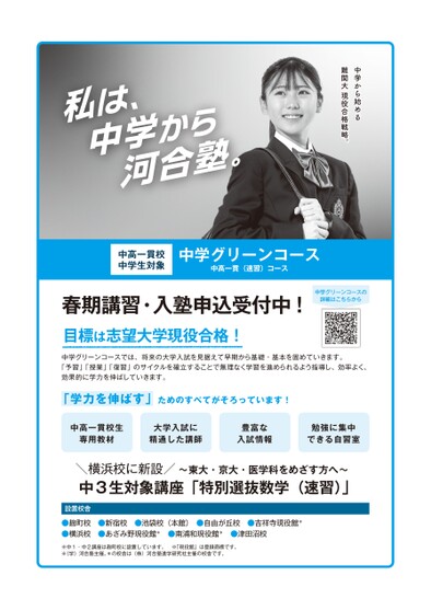 中学から始める難関大現役合格戦略。中高一貫校中学生対象中学グリーンコース中高一貫(速習)コース春期講習・入塾申込受付中!目標は志望大学現役合格!中学グリーンコースの詳細はこちらから中学グリーンコースでは、将来の大学入試を見据えて早期から基礎・基本を固めていきます。「予習」「授業」「復習」のサイクルを確立することで無理なく学習を進められるよう指導し、効率よく、効果的に学力を伸ばしていきます。「学力を伸ばす」ためのすべてがそろっています!中高一貫校生専用教材大学入試に精通した講師豊富な入試情報勉強に集中できる自習室\横浜校に新設/中3生対象講座「特別選抜数学(速習)」〜東大・京大・医学科をめざす方へ〜設置校舎●麹町校●新宿校●池袋校(本館)●自由が丘校●吉祥寺現役館*●横浜校●あざみ野現役館*●南浦和現役館*●津田沼校※中1・中2講座は麹町校に設置しています。※「現役館」は登録商標です。※(学)河合塾主催。*の校舎は(株)河合塾進学研究社主催の校舎です。