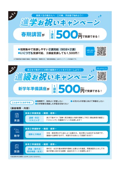 500(税込)円で受講できる!1講座春期講習が●短期集中で受講しやすい2講完結(90分×2講)●いくつでも受講可能、3講座受講しても1,500円!お申し込みはこちら※「受験英語の基礎の基礎」「難関物理」「難関化学」「個別指導講座」は本キャンペーンの対象外です。生高2新高2生で差がつく分野の重要ポイントをマスターしよう!お申し込みはこちら生高1新新高1生の皆さんへこの春、河合塾で始めよう!500(税込)円で受講できる!1講座新学年準備講座がこんなキミにおすすめ!〈講座種類・内容〉●短期間で、効率よく学習したい●4月からの学習に向けて準備をしたい●大学受験を意識した学習法を知りたい新高2準備英語-難関・標準-読解・作文・リスニング高2で差がつく「読解(英文構造と内容の理解)」「作文(頻出表現の確認)」「リスニング」の重要ポイントを伝授します!新高2準備数学-難関・標準-図形と方程式文系・理系問わず入試によく出題され、他分野にも波及する内容です。基礎から説明するので、未習の方も安心して受講できます!新高2準備国語-難関・標準-評論(現代文)歴史物語(古文)現代文・古文の基本事項や読解に必要な力を確認。問題演習をとおして今後の学習に活かせる読解・記述のポイントを習得します!英語数学国語*塾生優先申込期間にはお申し込みになれません。