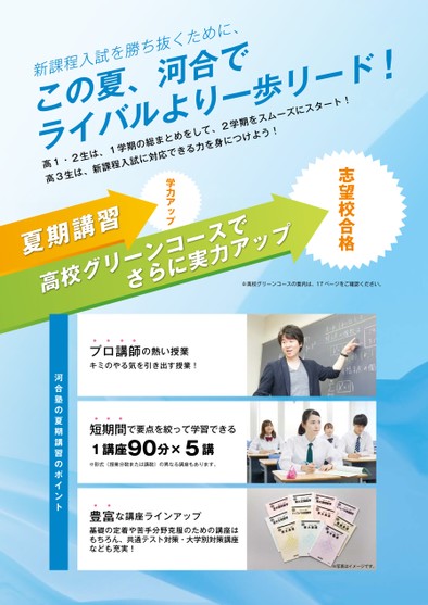 新課程入試を勝ち抜くために、この夏、河合でライバルより一歩リード!、身とでし力をるめきてを2に学つスうをよ期けム!ーズ!トにタスーま応総対のに期試学入1程、課は新生、2は・生13高高志望校合格学力アップ夏期講習高校グリーンコースでさらに実力アップ※高校グリーンコースの案内は、17ページをご確認ください。プロ講師の熱い授業キミのやる気を引き出す授業!短期間で要点を絞って学習できる1講座90分×5講※形式(授業分数または講数)の異なる講座もあります。豊富な講座ラインアップ基礎の定着や苦手分野克服のための講座はもちろん、共通テスト対策・大学別対策講座なども充実!※写真はイメージです。河合塾の夏期講習のポイント