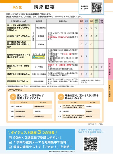高1生講座概要高2生講座概要学習したい内容からおすすめの講座種類をご案内します。講座名・授業形式および時間割などは、別途時間割冊子もしくはWebサイトでご確認ください。この夏学習したい内容講座種類講座の狙い英語数学国語物理化学日本史世界史学力をレベルアップさせたい方が対象の講座です。自分の学力レベルにピッタリな講座を選べます。河合塾の講座を初めて受講する方におすすめです。1学期の重要テーマを90分×2講で習得できる講座です。最後に確認テストを行い「できた!」を実感できます。*塾生優先申込ではお申し込みになれません。特定のテーマ・分野に絞って学習する講座です。自身の目的に応じて講座を選べます。この夏から対策を行い、大学入学共通テストで高得点をめざす講座です。学習プランナーと学習カウンセリングで決定した内容を、個別指導員が丁寧に指導します。〇〇〇〇〇〇〇〇〇〇〇〇〇〇〇〇〇〇〇〇一部の校舎・教室で設置しています。特別選抜講座難関講座標準講座レベル別講座東大・京大・医学部医学科現役合格をめざして今から対策したいさらにレベルアップしたい苦手科目を克服したい基本事項を理解・定着させたい短期集中で重要ポイントを押さえて学習したいダイジェスト講座強化したいテーマ・分野があるテーマ講座共通テスト対策を始めたい共通テスト対策講座個別指導を受けてみたい個別指導講座※夏期講習を受講するために「テスト」を受ける必要はありません。※校舎・教室によって設置講座が異なります。〈モデルプラン〉高2生講座概要講座を探す・申し込む▶東大・京大・医学部など難関大をめざすCさん理系志望で、夏から入試対策を始めたいDさん1ターム2ターム2ターム3ターム2限(自習室)特別選抜国語2限【ダイジェスト】夏から始める入試対策数学(難関・標準)(自習室)3限特別選抜英語(自習室)3限(自習室)4限特別選抜数学特別選抜化学4限【ダイジェスト】夏から始める入試対策英語(難関・標準)難関物理難関英語ダイジェスト講座3つの特長90分×2講完結で受講しやすい!1学期の重要テーマを短期集中で習得!最後の確認テストで「できた!」を実感!*塾生優先申込ではお申し込みになれません。※プランはイメージです。扱う分野および日程の詳細は、Webサイトからご確認ください▶