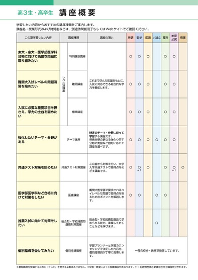 高3生・高卒生講座概要学習したい内容からおすすめの講座種類をご案内します。講座名・授業形式および時間割などは、別途時間割冊子もしくはWebサイトでご確認ください。この夏学習したい内容講座種類講座の狙い英語数学国語小論文理科地歴公民情報東大・京大・医学部医学科合格に向けて高度な問題に取り組みたい特別選抜講座〇〇〇〇〇難関講座これまで学んだ知識をもとに、入試に対応できる総合的な学力を養成します。〇〇〇〇〇レベル別講座難関大入試レベルの問題演習を始めたい入試に必要な重要項目を押さえ、学力の土台を固めたい標準講座〇〇〇〇〇強化したいテーマ・分野があるテーマ講座特定のテーマ・分野に絞って学習する講座です。得意分野の更なる強化や苦手分野の克服など目的に応じて講座を選べます。〇〇〇〇〇〇〇1〇*〇〇1〇*〇この夏から対策を行い、大学入学共通テストで高得点をめざす講座です。共通テスト対策を始めたい共通テスト対策講座医学部医学科など合格に向けて対策をしたい医進講座難関大医学部で要求されるハイレベルな問題で高得点を取るためのポイントを解説します。〇〇〇〇推薦入試に向けて対策をしたい総合型・学校推薦型選抜対策講座総合型・学校推薦型選抜で求められる能力、準備しておくことなどを学びます。〇個別指導を受けてみたい個別指導講座学習プランナーと学習カウンセリングで決定した内容を、個別指導員が丁寧に指導します。一部の校舎・教室で設置しています。※夏期講習を受講するために「テスト」を受ける必要はありません。※校舎・教室によって設置講座が異なります。*1旧課程生用と新課程生用で講座が分かれます。