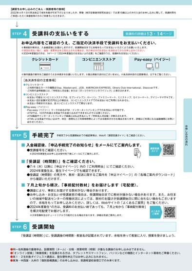 【講習をお申し込みのご本人・保護者等の皆様】2022年4月1日の民法改正で成年年齢が引き下げとなりましたが、弊塾(㈱河合塾進学研究社含む)では満18歳以上の方の入会のお申し込みに際して、受講料等をご負担いただく保護者等の方のご同意をいただきます。STEP4受講料の支払いをする受講料の詳細は13・14ページお申込内容をご確認のうえ、ご指定の決済手段で受講料をお支払いください。※事前配付教材は、入金確認後にお届けしますので、受講開始日までに余裕をもってお支払いいただくようお願いいたします。※初回お支払い後に、追加・変更申込を2回以上される場合は、先の申込分のお支払いを済ませてからお申し込みください。※2024年度塾生の方は、14ページ「2024年度塾生のお支払い上の注意」をご確認のうえ、受講料をお支払いください。クレジットカードコンビニエンスストアPay-easy(ペイジー)※操作画面の案内をご確認のうえお手続きをお願いいたします。※振込用紙の送付はございません。※各決済手段の注意事項は、以下をご覧ください。[各決済手段の注意事項]●クレジットカード・ご利用可能なカードの種類はVisa、Mastercard、JCB、AMERICANEXPRESS、DinersClubInternational、Discoverです。・ご利用代金明細書には、「学校法人河合塾」または「ガッコウホウジンカワイジュク」と表示されます。●コンビニエンスストア・お支払い可能なコンビニエンスストアは、セブン-イレブン、ローソン、ファミリーマート、ミニストップ、セイコーマート、デイリーヤマザキです。・お支払い合計金額が30万円以上の場合は、コンビニエンスストアでのお支払いはご利用になれません。・お支払い手続きの方法は、各コンビニエンスストアで異なります。●Pay-easy(ペイジー)・Pay-easy(ベイジー)マークのあるATM/インターネットバンキングでのお支払いが可能です。・ATMでは、10万円を超える現金でのお振り込みができませんのでご注意ください。・ATM画面やインターネットバンキング画面には払込先名として「学校法人河合塾」が表示されます。・ATMによる現金での払い込みや、休日・夜間などご利用時間帯によっては手数料がかかる場合があります。詳細はご利用になる金融機関にお問い合わせください。お申し込みの流れ講習受講ガイドSTEP5手続完了手続完了から受講開始までの確認事項は、Webの「講習受講ガイド」をご確認ください。■入金確認後、「申込手続完了のお知らせ」をメールにてご案内します。●受講番号をご確認ください。※2024年度塾生はお申し込み受付完了後にメールにてご案内します。■「受講証(時間割)」をご確認ください。●7/4(木)以降に「申込マイページ」内の「ご利用照会」にてご確認ください。2024年度塾生は、塾生マイページでも確認できます。●受講証(時間割)の見方や、教材・配送に関するご案内を「申込マイページ」の「各種ご案内ダウンロード」から確認いただけます。■7月上旬から順次、「事前配付教材」をお届けします(宅配便)。●講座により、事前にお届けする教材がない場合があります。●お申し込み・お支払いが受講直前の場合は、受講開始日までに教材が届かない場合があります。また、お住まいの地域や配送センターの稼働状況によっては、教材のお届けが受講開始日に間に合わない場合もございますので、余裕をもってお申し込みください。詳しくは、Webサイトの「よくあるご質問」をご覧ください。●2024年度塾生※の方は、受講料のお支払い前であっても、7月上旬から「事前配付教材」を順次宅配便でお届けします。よくあるご質問※大学受験科生はチュートリアルでの配付となる場合があります。詳細は別途ご案内します。STEP6受講開始「受講証(時間割)」に、受講講座の時間割・教室名が記載されています。余裕を持って教室に入り、授業を受けましょう。「オンライン授業」「映像授業」を受講される方は、タブレットやスマートフォン、パソコンなどの機器とインターネット環境をご準備ください。●同一名称講座の重複申込、設置期間(ターム)・日程・授業時間(時限)が重なる講座のお申し込みはできません。●●高1・2生対象ダイジェスト講座は、塾生優先申込ではお申し込みになれません。●東海・中四国・九州の「個別指導講座」のお申し込みは、受講希望校舎窓口でのみ承ります。