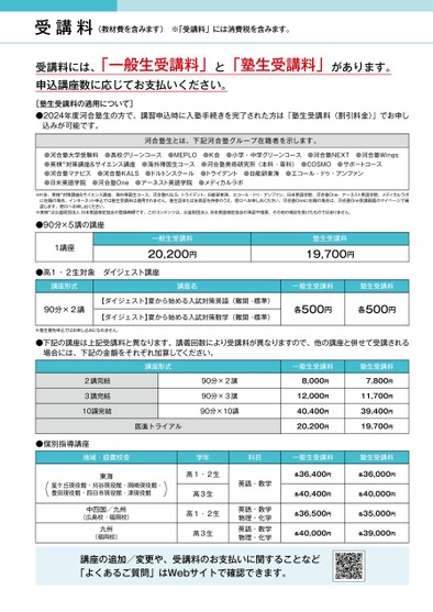 受講料(教材費を含みます)※「受講料」には消費税を含みます。受講料には、「一般生受講料」と「塾生受講料」があります。申込講座数に応じてお支払いください。[塾生受講料の適用について]●2024年度河合塾生の方で、講習申込時に入塾手続きを完了された方は「塾生受講料(割引料金)」でお申し込みが可能です。河合塾生とは、下記河合塾グループ在籍者を示します。●河合塾大学受験科●高校グリーンコース●MEPLO●K会●小学・中学グリーンコース●河合塾NEXT●河合塾Winɡs●英検対策講座&サイエンス講座●海外帰国生コース●河合塾美術研究所(本科・専科)●COSMO●サポートコース●河合塾マナビス●河合塾KALS●ドルトンスクール●トライデント●日能研東海●エコール・ドゥ・アンファン●日米英語学院●河合塾One●アーネスト英語学院●メディカルラボ※K会、英検対策講座&サイエンス講座、海外帰国生コース、河合塾KALS、トライデント、日能研東海、エコール・ドゥ・アンファン、日米英語学院、河合塾One、アーネスト英語学院、メディカルラボに在籍の場合、インターネット申込では塾生受講料は適用されません。塾生証または会員証を持参のうえ、窓口へお申し出ください。河合塾Oneに在籍の場合は、河合塾One受講画面のマイページで確認します。窓口へお申し出ください。※英検は公益財団法人日本英語検定協会の登録商標です。このコンテンツは、公益財団法人日本英語検定協会の承認や推奨、その他の検討を受けたものではありません。●90分×5講の講座1講座一般生受講料20,200円塾生受講料19,700円●高1・2生対象ダイジェスト講座講座形式90分×2講講座名一般生受講料塾生受講料【ダイジェスト】夏から始める入試対策英語(難関・標準)【ダイジェスト】夏から始める入試対策数学(難関・標準)各500円各500円※塾生優先申込ではお申し込みになれません。●下記の講座は上記受講料と異なります。講義回数により受講料が異なりますので、他の講座と併せて受講される場合には、下記の金額をそれぞれ加算してください。2講完結3講完結10講完結講座形式医進トライアル90分×2講90分×3講90分×10講一般生受講料8,000円12,000円40,400円20,200円塾生受講料7,800円11,700円39,400円19,700円●個別指導講座地域・設置校舎学年科目一般生受講料塾生受講料東海星ケ丘現役館・刈谷現役館・岡崎現役館・豊田現役館・四日市現役館・津現役館中四国/九州(広島校・福岡校)九州(福岡校)高1・2生高3生高1・2生高3生英語・数学英語・数学物理・化学英語・数学物理・化学各36,400円各36,000円各40,400円各40,000円各36,500円各35,000円各40,000円各39,000円講座の追加/変更や、受講料のお支払いに関することなど「よくあるご質問」はWebサイトで確認できます。