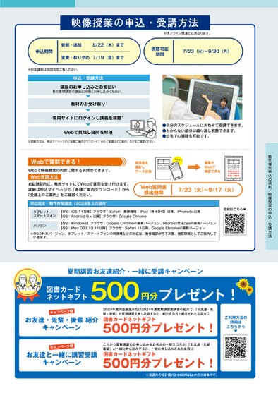 映像授業の申込・受講方法※オンライン授業とは異なります。申込期間新規・追加8/22(木)まで変更・取りやめ7/19(金)まで*対象講座は時間割をご覧ください。申込・受講方法講座のお申し込みとお支払い他の夏期講習の講座と同様にお申し込みください。教材のお受け取り専用サイトにログインし講義を視聴※Webで質問し疑問を解消視聴可能期間7/23(火)〜9/30(月)●自分のスケジュールにあわせて受講できます。●わからない部分は繰り返し視聴できます。●自宅での視聴も可能です。塾生優先申込の流れ/映像授業の申込・受講方法Webで質問できる!Webで映像授業の内容に関する質問ができます。Web質問方法質問書を撮影しデータ送信カシャ!回答がWebで確認できる右記期間内に、専用サイトにてWebで質問を受け付けます。詳細は申込マイページの「各種ご案内ダウンロード」から「受講上のご案内」をご確認ください。Web質問書提出期間7/23(火)〜9/17(火)対応端末・動作推奨環境(2024年3月現在)タブレット/スマートフォン【OS:iOS14以降】ブラウザ:Safari推奨機種:iPad(第4世代)以降、iPhone5s以降【OS:Android9.x以降】ブラウザ:GoogleChromeパソコン【OS:Windows】ブラウザ:GoogleChromeの最新バージョン、MicrosoftEdgeの最新バージョン【OS:MacOSⅩ10.11以降】ブラウザ:Safari11以降、GoogleChromeの最新バージョン※OSの将来バージョン、タブレット/スマートフォンの新機種などの対応は、動作確認が完了次第、推奨環境としてご案内していきます。詳細はこちら▼※視聴方法は、申込マイページの「各種ご案内ダウンロード」から「受講上のご案内」などをご確認ください。夏期講習お友達紹介・一緒に受講キャンペーン500図書カードネットギフトキャンペーン❶円分プレゼント!お友達・先輩・後輩紹介キャンペーン2024年度河合塾生または2024年度夏期講習受講者の紹介で、「お友達・先輩・後輩」が夏期講習を申し込みすると、紹介する方と紹介された方双方に図書カードネットギフト500円分プレゼント!ご利用方法の詳細はこちらから▶キャンペーン❷お友達と一緒に講習受講キャンペーンこれから夏期講習のお申し込みをお考えの一般生の方が、「お友達・先輩・後輩」と一緒に申し込みすると、一緒に申し込みされた全員に図書カードネットギフト500円分プレゼント!※受講料の合計額が2,500円以上の方が対象です。