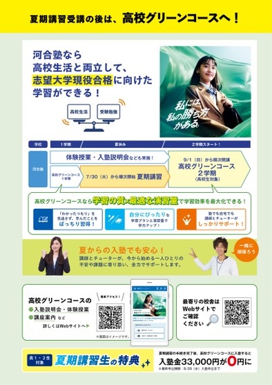 夏期講習受講の後は、高校グリーンコースへ!河合塾なら高校生活と両立して、志望大学現役合格に向けた学習ができる!高校生活受験勉強学校1学期夏休み2学期スタート!体験授業・入塾説明会なども実施!河合塾高校グリーンコース1学期7/30(火)から順次開始夏期講習9/1(日)から順次開講高校グリーンコース2学期(高校生対象)高校グリーンコースならで学習効果を最大化できる!学習の質×最適な演習量「わかったつもり」を見逃さず、学んだことをばっちり習得!自分にぴったりな学習プランと演習量で学力アップ!塾でも自宅でも講師とチューターがしっかりサポート!夏からの入塾でも安心!講師とチューターが、今から始める一人ひとりの不安や課題に寄り添い、全力でサポートします。一緒に頑張ろう高校グリーンコースの●入塾説明会・体験授業●講座案内など詳しくはWebサイトへ▼高校グリーンコースログインお気に入りカート簡単アクセス!高校生対象高校グリーンコース入塾受付中高校グリーンコースは志望大学現役合格をめざす、高校生を対象としたコースです。入塾のお申し込みはこちら講座を探す・申し込む手続完了〜受講開始までの準備※画面はイメージです。最寄りの校舎はWebサイトでご確認ください高1・2生対象夏期講習の手続き完了後、高校グリーンコースに入塾すると入塾金33,000円が円に※最終申込期限:8/28(水)入塾申込まで0