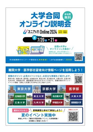 大学合同参加費無料オンライン説明会中学生・高校生高卒生・保護者Summer夏土日全国の大学がオンラインに大集合!新課程入試、大学入学共通テスト…変化に打ち勝ち合格をつかみ取ろう!難関大学・医学部志望者向け情報ページを活用しよう!受験のポイント・必見のイベントなど、お役立ち情報をご紹介します。東京大学、京都大学、医学部、北海道大学、東北大学、名古屋大学、大阪大学、広島大学、九州大学、早稲田大学、慶應義塾大学をめざすキミに向けて、受験対策のポイント・イベント情報・合格した先輩たちの声などをご紹介します。今すぐチェック!▶東京大学京都大学医学部北海道大学東北大学名古屋大学大阪大学広島大学九州大学早稲田大学慶應義塾大学夏のイベント!夏期講習と併せて参加しよう!夏のイベント実施中参加しやすい「無料の学習対策イベント」を多数実施!お気軽にご参加ください!詳細はこちら▶