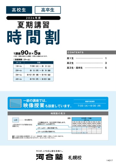 高校生高卒生2024年度夏期講習1講座90分×5講※形式(授業分数または講数)の異なる講座もあります。◎設置期間(ターム)ターム1ターム2ターム3ターム4ターム日程7/30(火)〜8/3(土)8/5(月)〜8/9(金)8/12(月・振)〜8/16(金)8/19(月)〜8/23(金)CONTENTS高1生高2生………………………………………………………………高3生・高卒生……………………135一部の講座では、映像授業も設置しています。視聴可能期間7/23(火)〜9/30(月)山田担当講師名上記の色のマスが授業のある時限です。時間割の見方この講座は8/8・9の2日間で完結します。授業は2タームの6限です。2タームの1・2限が授業です。2タームの3限が授業です。●同一名称の講座は設置期間(ターム)・授業時間(時限)が異なっても同一内容です。●担当講師は変更になる場合がありますので、あらかじめご了承ください。(例)110:0011:30211:5013:20池田8/5(月)〜9(金)2ターム3414:3016:0016:2017:50518:1019:408/8・9の2日間➡620:0021:30松原畑中・阪上・杉井札幌校14017