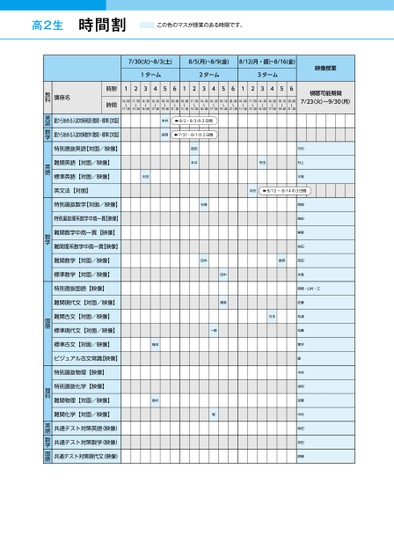 高2生時間割この色のマスが授業のある時限です。7/30(火)~8/3(土)8/5(月)~8/9(金)8/12(月・振)~8/16(金)1ターム2ターム3ターム映像授業映像授業視聴可能期間:7/23火)〜9/30月)1234561234561234561325視聴可能期間4610:00〜11:3011:50〜13:2014:30〜16:0016:20〜17:5018:10〜19:4020:00〜21:3010:00〜11:3011:50〜13:2014:30〜16:0016:20〜17:5018:10〜19:4020:00〜21:3010:00〜11:3011:50〜13:2014:30〜16:0016:20〜17:5018:10〜19:4020:00〜21:3011:5014:307/23火)~9/30月)〜21:30〜13:20〜16:00〜19:4016:20〜17:5010:00〜11:3018:1020:00本井➡8/2・8/3の2日間長岡➡7/31・8/1の2日間西田本井宇田竹内村上大島太田➡8/12~8/14の3日間石部田中田中篠原一路堀長岡川本西畑高田秦野依田宮田永島高橋・山村・江佐藤松浦松藤菅井園木村浅利加藤中村柴田依田高橋講座名時限時間夏から始める入試対策英語(難関・標準)対面】夏から始める入試対策数学(難関・標準)対面】特別選抜英語【対面/映像】難関英語【対面/映像】標準英語【対面/映像】太田英文法【対面】特別選抜数学【対面/映像】特別選抜理系数学中高一貫【映像】難関数学中高一貫【映像】難関理系数学中高一貫【映像】難関数学【対面/映像】標準数学【対面/映像】特別選抜国語【映像】難関現代文【対面/映像】難関古文【対面/映像】標準現代文【対面/映像】標準古文【対面/映像】ビジュアル古文常識【映像】特別選抜物理【映像】特別選抜化学【映像】難関物理【対面/映像】難関化学【対面/映像】共通テスト対策英語(映像)共通テスト対策数学(映像)共通テスト対策現代文(映像)福田島村教科英語数学英語数学国語理科英語数学国語●2024年度/夏期講習/北海道/札幌/高2生/パターン14302024_56_1_151_32_20240401114130.csv/1ページ校了時削除