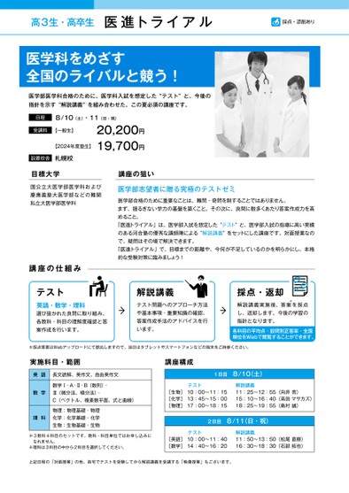 高3生・高卒生医進トライアル採点・添削あり医学科をめざす全国のライバルと競う!医学部医学科合格のために、医学科入試を想定した指針を示すを組み合わせた、この夏必須の講座です。“解説講義”“テスト”と、今後の日程8/10(土)・11(日・祝)20,200円19,700円受講料【一般生】【2024年度塾生】設置校舎札幌校目標大学国公立大医学部医学科および慶應義塾大医学部などの難関私立大医学部医学科講座の仕組み講座の狙い医学部志望者に贈る究極のテストゼミ医学部合格のために重要なことは、難問・奇問を制することではありません。まず、揺るぎない学力の基盤を築くこと。その次に、良問に数多くあたり答案作成力を高めること。「医進トライアル」は、医学部入試を想定した“テスト”と、医学部入試の指導に高い実績のある河合塾の優秀な講師陣による“解説講義”をセットにした講座です。対面授業なので、疑問はその場で解決できます。「医進トライアル」で、目標までの距離や、今何が不足しているのかを明らかにし、本格的な受験対策に臨みましょう!テスト英語・数学・理科選び抜かれた良問に取り組み、各教科・科目の理解度確認と答案作成を行います。解説講義テスト問題へのアプローチ方法や基本事項・重要知識の確認、答案作成手法のアドバイスを行います。採点・返却※解説講義実施後、答案を採点し、返却します。今後の学習の指針となります。各科目の平均点・設問別正答率・全国順位をWebで閲覧することができます。※採点答案はWebアップロードにて提出しますので、当日はタブレットやスマートフォンなどの端末をご持参ください。実施科目・範囲英語長文読解、英作文、自由英作文数学理科数学Ⅰ・A・Ⅱ・B(数列)・Ⅲ(微分法、積分法)・C(ベクトル、複素数平面、式と曲線)物理:物理基礎・物理化学:化学基礎・化学生物:生物基礎・生物講座構成1日目8/10(土)[生物][化学][物理]テスト10:00〜11:1513:45〜15:0017:00〜18:15解説講義11:25〜12:55(向井亮)15:10〜16:40(高田マサカズ)18:25〜19:55(島村誠)2日目8/11(日・祝)※3教科4科目のセットです。教科・科目単位ではお申し込みになれません。※理科は3科目の中から2科目を選択してください。[英語][数学]テスト10:00〜11:4014:40〜16:20解説講義11:50〜13:50(松尾直樹)16:30〜18:30(石部拓也)上記日程の「対面授業」の他、自宅でテストを受験してから解説講義を受講する「映像授業」もございます。