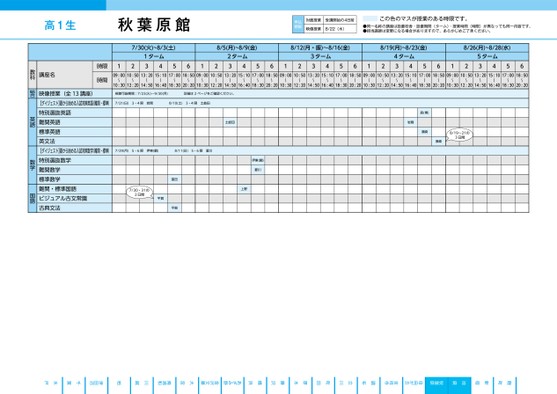 高1生秋葉原館申込期限対面授業受講開始の4日前映像授業8/22(木)この色のマスが授業のある時限です。●同一名称の講座は設置校舎・設置期間(ターム)・授業時間(時限)が異なっても同一内容です。●担当講師は変更になる場合がありますので、あらかじめご了承ください。7/30(火)~8/3(土)8/5(月)~8/9(金)8/12(月・振)〜8/16(金)8/19(月)~8/23(金)8/26(月)~8/28(水)1ターム341256122ターム3456123ターム3456124ターム3456125ターム345609:0010:5013:2015:1017:0018:5009:0010:5013:2015:1017:0018:5009:0010:5013:2015:1017:0018:5009:0010:5013:2015:1017:0018:5009:0010:5013:2015:1017:0018:50〜〜〜〜〜〜〜〜〜〜〜〜〜〜〜〜〜〜〜〜〜〜〜〜〜〜〜〜〜〜10:3012:2014:5016:4018:3020:2010:3012:2014:5016:4018:3020:2010:3012:2014:5016:4018:3020:2010:3012:2014:5016:4018:3020:2010:3012:2014:5016:4018:3020:20視聴可能期間:7/23(火)〜9/30(月)詳細は2ページをご確認ください。7/21(日)3・4限岩間8/10(土)3・4限土岐田土岐田伊東(鋼)夏川上野7/29(月)5・6限伊東(鋼)8/11(日)5・6限夏川7/30・31の2日間平賀窪田平賀岩間森(博)濱崎8/19~21の3日間濱崎講座名時限時間映像授業(全13講座)【ダイジェスト】夏から始める入試対策英語(難関・標準)特別選抜英語難関英語標準英語英文法【ダイジェスト】夏から始める入試対策数学(難関・標準)特別選抜数学難関数学標準数学難関・標準国語ビジュアル古文常識古典文法教科総合英語数学国語●2024年度/夏期講習/東日本/秋葉原/高1生/パターン3560南浦和津田沼金沢文庫柏2024_56_3_368_31_20240329103552.csv/1ページ自由が丘あざみ野吉祥寺秋葉原厚木町田立川調布横浜藤沢池袋校了時削除新宿麹町水戸千葉川越大宮