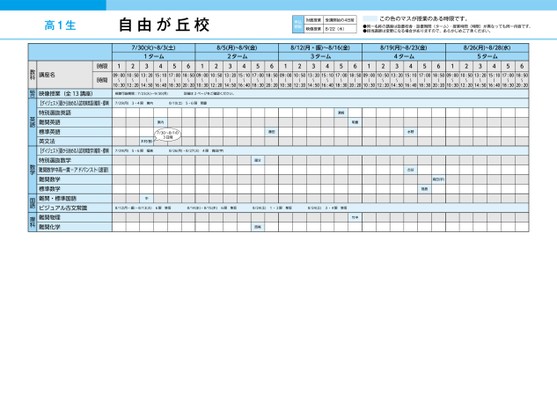 高1生自由が丘校申込期限対面授業受講開始の4日前映像授業8/22(木)この色のマスが授業のある時限です。●同一名称の講座は設置校舎・設置期間(ターム)・授業時間(時限)が異なっても同一内容です。●担当講師は変更になる場合がありますので、あらかじめご了承ください。7/30(火)~8/3(土)8/5(月)~8/9(金)8/12(月・振)〜8/16(金)8/19(月)~8/23(金)8/26(月)~8/28(水)1ターム341256122ターム3456123ターム3456124ターム3456125ターム345609:0010:5013:2015:1017:0018:5009:0010:5013:2015:1017:0018:5009:0010:5013:2015:1017:0018:5009:0010:5013:2015:1017:0018:5009:0010:5013:2015:1017:0018:50〜〜〜〜〜〜〜〜〜〜〜〜〜〜〜〜〜〜10:3012:2014:5016:4018:3020:2010:3012:2014:5016:4018:3020:2010:3012:2014:5016:4018:3020:2010:3012:2014:5016:4018:3020:2010:3012:2014:5016:4018:3020:20〜〜〜〜〜〜〜〜〜〜〜〜視聴可能期間:7/23(火)〜9/30(月)詳細は2ページをご確認ください。7/29(月)3・4限東内8/10(土)5・6限明慶東内7/30~8/1の3日間木村(智)7/29(月)5・6限福島8/26(月)・8/27(火)4限高田(宇)藤田國分瀬﨑明慶中8/12(月・振)・8/13(火)6限隼坂8/14(水)・8/15(木)6限隼坂8/24(土)1・2限隼坂8/24(土)3・4限隼坂西尾竹中水野古谷高田(宇)福島講座名時限時間映像授業(全13講座)【ダイジェスト】夏から始める入試対策英語(難関・標準)特別選抜英語難関英語標準英語英文法【ダイジェスト】夏から始める入試対策数学(難関・標準)特別選抜数学難関数学中高一貫-アドバンスト(速習)難関数学標準数学難関・標準国語ビジュアル古文常識難関物理難関化学教科総合英語数学国語理科●2024年度/夏期講習/東日本/自由が丘/高1生/パターン35602024_56_3_337_31_20240329103552.csv/1ページ校了時削除