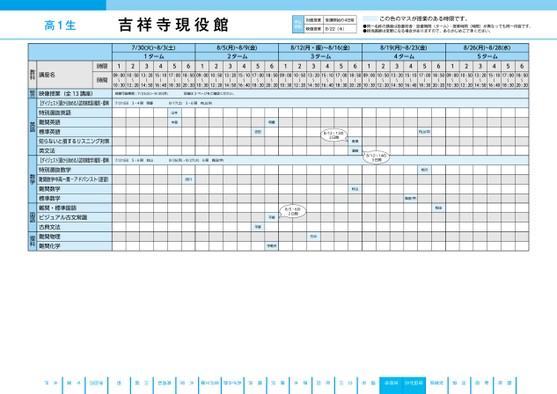 高1生吉祥寺現役館申込期限対面授業受講開始の4日前映像授業8/22(木)この色のマスが授業のある時限です。●同一名称の講座は設置校舎・設置期間(ターム)・授業時間(時限)が異なっても同一内容です。●担当講師は変更になる場合がありますので、あらかじめご了承ください。7/30(火)~8/3(土)8/5(月)~8/9(金)8/12(月・振)〜8/16(金)8/19(月)~8/23(金)8/26(月)~8/28(水)1ターム341256122ターム3456123ターム3456124ターム3456125ターム345609:0010:5013:2015:1017:0018:5009:0010:5013:2015:1017:0018:5009:0010:5013:2015:1017:0018:5009:0010:5013:2015:1017:0018:5009:0010:5013:2015:1017:0018:50〜〜〜〜〜〜〜〜〜〜〜〜〜〜〜〜〜〜〜〜〜〜〜〜〜〜〜〜〜〜10:3012:2014:5016:4018:3020:2010:3012:2014:5016:4018:3020:2010:3012:2014:5016:4018:3020:2010:3012:2014:5016:4018:3020:2010:3012:2014:5016:4018:3020:20視聴可能期間:7/23(火)〜9/30(月)詳細は2ページをご確認ください。7/21(日)3・4限明慶8/17(土)5・6限内山(洋)山本中島7/21(日)5・6限秋山8/26(月)・8/27(火)6限高田(宇)流川明慶吉田8/12・13の2日間8/5・6の2日間竹中平賀平賀宇野沢8/12~14の3日間青柳濱崎秋山内山(洋)相川高田(宇)和田講座名時限時間映像授業(全13講座)【ダイジェスト】夏から始める入試対策英語(難関・標準)特別選抜英語難関英語標準英語知らないと損するリスニング対策英文法【ダイジェスト】夏から始める入試対策数学(難関・標準)特別選抜数学難関数学中高一貫-アドバンスト(速習)難関数学標準数学難関・標準国語ビジュアル古文常識古典文法難関物理難関化学教科総合英語数学国語理科●2024年度/夏期講習/東日本/吉祥寺/高1生/パターン3560南浦和津田沼金沢文庫柏2024_56_3_340_31_20240329103552.csv/1ページ自由が丘あざみ野吉祥寺秋葉原厚木町田立川調布横浜藤沢池袋校了時削除新宿麹町水戸千葉川越大宮