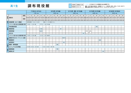 高1生調布現役館申込期限対面授業受講開始の4日前映像授業8/22(木)この色のマスが授業のある時限です。●同一名称の講座は設置校舎・設置期間(ターム)・授業時間(時限)が異なっても同一内容です。●担当講師は変更になる場合がありますので、あらかじめご了承ください。7/30(火)~8/3(土)8/5(月)~8/9(金)8/12(月・振)〜8/16(金)8/19(月)~8/23(金)8/26(月)~8/28(水)1ターム341256122ターム3456123ターム3456124ターム3456125ターム345609:0010:5013:2015:1017:0018:5009:0010:5013:2015:1017:0018:5009:0010:5013:2015:1017:0018:5009:0010:5013:2015:1017:0018:5009:0010:5013:2015:1017:0018:50〜〜〜〜〜〜〜〜〜〜〜〜〜〜〜〜〜〜10:3012:2014:5016:4018:3020:2010:3012:2014:5016:4018:3020:2010:3012:2014:5016:4018:3020:2010:3012:2014:5016:4018:3020:2010:3012:2014:5016:4018:3020:20〜〜〜〜〜〜〜〜〜〜〜〜視聴可能期間:7/23(火)〜9/30(月)詳細は2ページをご確認ください。7/29(月)3・4限松野8/17(土)5・6限吉川(量)吉川(量)内山(洋)7/29(月)5・6限佐藤8/11(日)5・6限高田(宇)8/19(月)・8/20(火)4限貴川8/21(水)・8/22(木)4限貴川松野高田(宇)窪田税田宇都中園8/12~14の3日間岡本佐藤安東講座名時限時間映像授業(全13講座)【ダイジェスト】夏から始める入試対策英語(難関・標準)特別選抜英語難関英語標準英語英文法【ダイジェスト】夏から始める入試対策数学(難関・標準)難関数学中高一貫-アドバンスト(速習)難関数学標準数学難関・標準国語ビジュアル古文常識難関物理難関化学教科総合英語数学国語理科●2024年度/夏期講習/東日本/調布/高1生/パターン35602024_56_3_367_31_20240329103552.csv/1ページ校了時削除