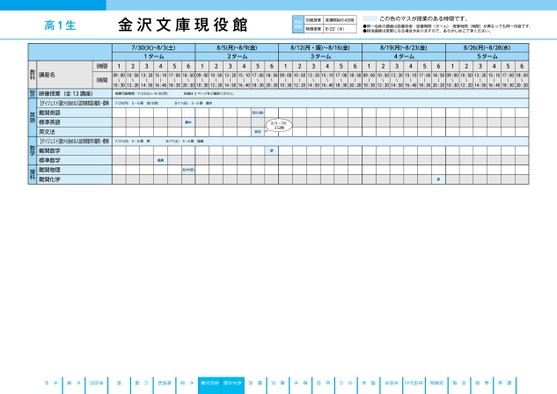 高1生金沢文庫現役館申込期限対面授業受講開始の4日前映像授業8/22(木)この色のマスが授業のある時限です。●同一名称の講座は設置校舎・設置期間(ターム)・授業時間(時限)が異なっても同一内容です。●担当講師は変更になる場合がありますので、あらかじめご了承ください。7/30(火)~8/3(土)8/5(月)~8/9(金)8/12(月・振)〜8/16(金)8/19(月)~8/23(金)8/26(月)~8/28(水)1ターム341256122ターム3456123ターム3456124ターム3456125ターム345609:0010:5013:2015:1017:0018:5009:0010:5013:2015:1017:0018:5009:0010:5013:2015:1017:0018:5009:0010:5013:2015:1017:0018:5009:0010:5013:2015:1017:0018:50〜〜〜〜〜〜〜〜〜〜〜〜〜〜〜〜〜〜〜〜〜〜〜〜〜〜〜〜〜〜10:3012:2014:5016:4018:3020:2010:3012:2014:5016:4018:3020:2010:3012:2014:5016:4018:3020:2010:3012:2014:5016:4018:3020:2010:3012:2014:5016:4018:3020:20視聴可能期間:7/23(火)〜9/30(月)詳細は2ページをご確認ください。7/29(月)5・6限吉川(幸)8/11(日)5・6限鏑木鏑木7/21(日)5・6限堺8/17(土)5・6限福島福島佐々木(哲)吉川(幸)安井8/5~7の3日間堺原講座名時限時間映像授業(全13講座)【ダイジェスト】夏から始める入試対策英語(難関・標準)難関英語標準英語英文法【ダイジェスト】夏から始める入試対策数学(難関・標準)難関数学標準数学難関物理難関化学教科総合英語数学理科●2024年度/夏期講習/東日本/金沢文庫/高1生/パターン3560南浦和津田沼金沢文庫柏2024_56_3_335_31_20240329103552.csv/1ページ自由が丘あざみ野吉祥寺秋葉原厚木町田立川調布横浜藤沢池袋校了時削除新宿麹町水戸千葉川越大宮