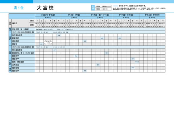 高1生大宮校申込期限対面授業受講開始の4日前映像授業8/22(木)この色のマスが授業のある時限です。●同一名称の講座は設置校舎・設置期間(ターム)・授業時間(時限)が異なっても同一内容です。●担当講師は変更になる場合がありますので、あらかじめご了承ください。7/30(火)~8/3(土)8/5(月)~8/9(金)8/12(月・振)〜8/16(金)8/19(月)~8/23(金)8/26(月)~8/28(水)1ターム341256122ターム3456123ターム3456124ターム3456125ターム345609:0010:5013:2015:1017:0018:5009:0010:5013:2015:1017:0018:5009:0010:5013:2015:1017:0018:5009:0010:5013:2015:1017:0018:5009:0010:5013:2015:1017:0018:50〜〜〜〜〜〜〜〜〜〜〜〜〜〜〜〜〜〜10:3012:2014:5016:4018:3020:2010:3012:2014:5016:4018:3020:2010:3012:2014:5016:4018:3020:2010:3012:2014:5016:4018:3020:2010:3012:2014:5016:4018:3020:20〜〜〜〜〜〜〜〜〜〜〜〜視聴可能期間:7/23(火)〜9/30(月)詳細は2ページをご確認ください。7/29(月)3・4限山川8/26(月)・8/27(火)5限明慶明慶7/30~8/1の3日間川原7/29(月)5・6限國分8/11(日)5・6限秦野秦野杉山岩間岡島山川川原國分福田中林・品田河本宇都講座名時限時間映像授業(全13講座)【ダイジェスト】夏から始める入試対策英語(難関・標準)特別選抜英語難関英語標準英語英文法【ダイジェスト】夏から始める入試対策数学(難関・標準)特別選抜数学難関数学中高一貫-アドバンスト(速習)難関数学標準数学難関・標準国語古典文法難関物理難関化学教科総合英語数学国語理科●2024年度/夏期講習/東日本/大宮/高1生/パターン35602024_56_3_324_31_20240329103552.csv/1ページ校了時削除