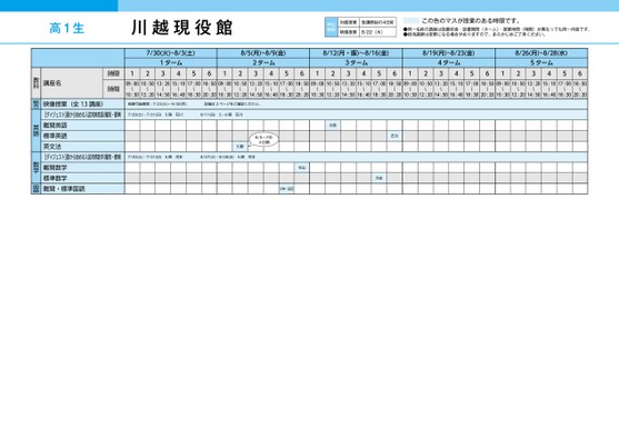 高1生川越現役館申込期限対面授業受講開始の4日前映像授業8/22(木)この色のマスが授業のある時限です。●同一名称の講座は設置校舎・設置期間(ターム)・授業時間(時限)が異なっても同一内容です。●担当講師は変更になる場合がありますので、あらかじめご了承ください。7/30(火)~8/3(土)8/5(月)~8/9(金)8/12(月・振)〜8/16(金)8/19(月)~8/23(金)8/26(月)~8/28(水)1ターム341256122ターム3456123ターム3456124ターム3456125ターム345609:0010:5013:2015:1017:0018:5009:0010:5013:2015:1017:0018:5009:0010:5013:2015:1017:0018:5009:0010:5013:2015:1017:0018:5009:0010:5013:2015:1017:0018:50〜〜〜〜〜〜〜〜〜〜〜〜〜〜〜〜〜〜10:3012:2014:5016:4018:3020:2010:3012:2014:5016:4018:3020:2010:3012:2014:5016:4018:3020:2010:3012:2014:5016:4018:3020:2010:3012:2014:5016:4018:3020:20〜〜〜〜〜〜〜〜〜〜〜〜視聴可能期間:7/23(火)〜9/30(月)詳細は2ページをご確認ください。7/20(土)・7/21(日)5限石川8/11(日)5・6限石川川原8/5~7の3日間川原7/20(土)・7/21(日)6限河本8/27(火)・8/28(水)6限河本杉山小林・品田石川河本講座名時限時間映像授業(全13講座)【ダイジェスト】夏から始める入試対策英語(難関・標準)難関英語標準英語英文法【ダイジェスト】夏から始める入試対策数学(難関・標準)難関数学標準数学難関・標準国語教科総合英語数学国語●2024年度/夏期講習/東日本/川越/高1生/パターン35602024_56_3_333_31_20240329103552.csv/1ページ校了時削除