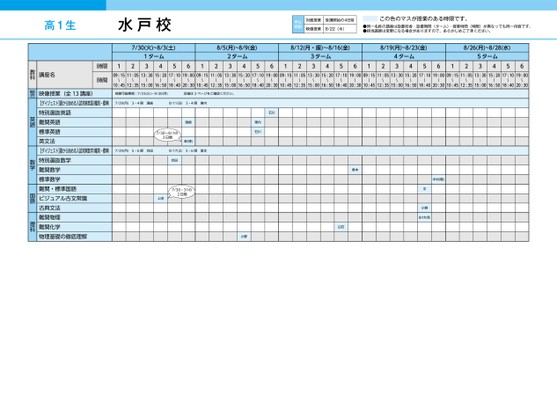 高1生水戸校申込期限対面授業受講開始の4日前映像授業8/22(木)この色のマスが授業のある時限です。●同一名称の講座は設置校舎・設置期間(ターム)・授業時間(時限)が異なっても同一内容です。●担当講師は変更になる場合がありますので、あらかじめご了承ください。7/30(火)~8/3(土)8/5(月)~8/9(金)8/12(月・振)〜8/16(金)8/19(月)~8/23(金)8/26(月)~8/28(水)1ターム341256122ターム3456123ターム3456124ターム3456125ターム345609:1511:0513:3015:2017:1019:0009:1511:0513:3015:2017:1019:0009:1511:0513:3015:2017:1019:0009:1511:0513:3015:2017:1019:0009:1511:0513:3015:2017:1019:00〜〜〜〜〜〜〜〜〜〜〜〜〜〜〜〜〜〜10:4512:3515:0016:5018:4020:3010:4512:3515:0016:5018:4020:3010:4512:3515:0016:5018:4020:3010:4512:3515:0016:5018:4020:3010:4512:3515:0016:5018:4020:30〜〜〜〜〜〜〜〜〜〜〜〜視聴可能期間:7/23(火)〜9/30(月)詳細は2ページをご確認ください。7/29(月)3・4限濱崎8/11(日)3・4限東内7/30~8/1の3日間濱崎森(博)7/29(月)5・6限合田8/17(土)5・6限塚本合田石川東内石川7/30・31の2日間上田小野塚本白石中村(隆)中小野佐々木(哲)講座名時限時間映像授業(全13講座)【ダイジェスト】夏から始める入試対策英語(難関・標準)特別選抜英語難関英語標準英語英文法【ダイジェスト】夏から始める入試対策数学(難関・標準)特別選抜数学難関数学標準数学難関・標準国語ビジュアル古文常識古典文法難関物理難関化学物理基礎の徹底理解教科総合英語数学国語理科●2024年度/夏期講習/東日本/水戸/高1生/パターン35602024_56_3_344_31_20240329103552.csv/1ページ校了時削除