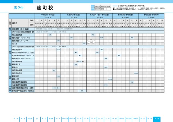 高2生麹町校申込期限対面授業受講開始の4日前映像授業8/22(木)この色のマスが授業のある時限です。●同一名称の講座は設置校舎・設置期間(ターム)・授業時間(時限)が異なっても同一内容です。●担当講師は変更になる場合がありますので、あらかじめご了承ください。7/30(火)~8/3(土)8/5(月)~8/9(金)8/12(月・振)〜8/16(金)8/19(月)~8/23(金)8/26(月)~8/28(水)1ターム341256122ターム3456123ターム3456124ターム3456125ターム345609:0010:5013:2015:1017:0018:5009:0010:5013:2015:1017:0018:5009:0010:5013:2015:1017:0018:5009:0010:5013:2015:1017:0018:5009:0010:5013:2015:1017:0018:50〜〜〜〜〜〜〜〜〜〜〜〜〜〜〜〜〜〜〜〜〜〜〜〜〜〜〜〜〜〜10:3012:2014:5016:4018:3020:2010:3012:2014:5016:4018:3020:2010:3012:2014:5016:4018:3020:2010:3012:2014:5016:4018:3020:2010:3012:2014:5016:4018:3020:20視聴可能期間:7/23(火)〜9/30(月)詳細は27ページをご確認ください。7/29(月)3・4限新野8/26(月)5・6限木村(智)佐藤押田新野木村(智)押田是枝8/5~7の3日間秋谷7/29(月)5・6限竹内8/27(火)5・6限伊東(敦)広瀬亀山亀山川野・園・豊崎川野加藤杉山杉山坂本(勝)郷田竹内成合竹内小野木鈴木(翔)鈴木(翔)向井(勇)杉山講座名時限時間映像授業(全22講座)【ダイジェスト】夏から始める入試対策英語(難関・標準)特別選抜英語難関英語-トップレベル難関英語-ハイレベル英文法【ダイジェスト】夏から始める入試対策数学(難関・標準)特別選抜数学難関理系数学中高一貫-アドバンスト(速習)難関数学中高一貫-アドバンスト難関数学-トップレベル特別選抜国語難関現代文難関古文特別選抜物理特別選抜化学難関物理難関化学物理基礎の徹底理解化学基礎の徹底理解日本史集中講義(古代―近世)世界史集中講義(古代―18世紀)教科総合英語数学国語理科地歴●2024年度/夏期講習/東日本/麹町/高2生/パターン3560南浦和津田沼柏金沢文庫2024_56_3_328_32_20240329103407.csv/1ページ自由が丘あざみ野吉祥寺秋葉原厚木町田立川調布横浜藤沢池袋校了時削除新宿麹町水戸千葉川越大宮