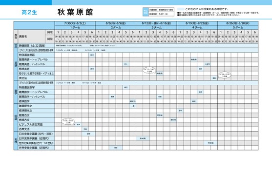 高2生秋葉原館申込期限対面授業受講開始の4日前映像授業8/22(木)この色のマスが授業のある時限です。●同一名称の講座は設置校舎・設置期間(ターム)・授業時間(時限)が異なっても同一内容です。●担当講師は変更になる場合がありますので、あらかじめご了承ください。7/30(火)~8/3(土)8/5(月)~8/9(金)8/12(月・振)〜8/16(金)8/19(月)~8/23(金)8/26(月)~8/28(水)1ターム341256122ターム3456123ターム3456124ターム3456125ターム345609:0010:5013:2015:1017:0018:5009:0010:5013:2015:1017:0018:5009:0010:5013:2015:1017:0018:5009:0010:5013:2015:1017:0018:5009:0010:5013:2015:1017:0018:50〜〜〜〜〜〜〜〜〜〜〜〜〜〜〜〜〜〜10:3012:2014:5016:4018:3020:2010:3012:2014:5016:4018:3020:2010:3012:2014:5016:4018:3020:2010:3012:2014:5016:4018:3020:2010:3012:2014:5016:4018:3020:20〜〜〜〜〜〜〜〜〜〜〜〜視聴可能期間:7/23(火)〜9/30(月)詳細は27ページをご確認ください。7/29(月)4・5限髙橋(保)8/10(土)5・6限土岐田田口成川7/21(日)4・5限遠藤8/11(日)5・6限生田村上郷田遠藤高梨(大)一瀬7/30・31の2日間平賀平賀富増8/12~14の3日間髙橋(保)髙橋(保)土岐田清川8/19~21の3日間濱崎渡辺島田生田阿部(誠)野中酒井(完)坂本(勝)沼田平尾(雅)講座名時限時間映像授業(全22講座)【ダイジェスト】夏から始める入試対策英語(難関・標準)特別選抜英語難関英語-トップレベル難関英語-ハイレベル標準英語知らないと損する熟語・イディオム英文法【ダイジェスト】夏から始める入試対策数学(難関・標準)特別選抜数学難関数学-トップレベル難関数学-ハイレベル標準数学難関現代文標準現代文難関古文標準古文ビジュアル古文常識古典文法日本史集中講義(古代―近世)日本史集中講義(近現代)世界史集中講義(古代―18世紀)世界史集中講義(近現代)教科総合英語数学国語地歴●2024年度/夏期講習/東日本/秋葉原/高2生/パターン35602024_56_3_368_32_20240329103407.csv/1ページ校了時削除