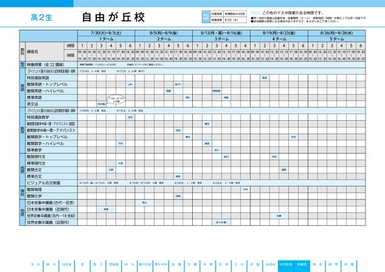 高2生自由が丘校申込期限対面授業受講開始の4日前映像授業8/22(木)この色のマスが授業のある時限です。●同一名称の講座は設置校舎・設置期間(ターム)・授業時間(時限)が異なっても同一内容です。●担当講師は変更になる場合がありますので、あらかじめご了承ください。7/30(火)~8/3(土)8/5(月)~8/9(金)8/12(月・振)〜8/16(金)8/19(月)~8/23(金)8/26(月)~8/28(水)1ターム341256122ターム3456123ターム3456124ターム3456125ターム345609:0010:5013:2015:1017:0018:5009:0010:5013:2015:1017:0018:5009:0010:5013:2015:1017:0018:5009:0010:5013:2015:1017:0018:5009:0010:5013:2015:1017:0018:50〜〜〜〜〜〜〜〜〜〜〜〜〜〜〜〜〜〜〜〜〜〜〜〜〜〜〜〜〜〜10:3012:2014:5016:4018:3020:2010:3012:2014:5016:4018:3020:2010:3012:2014:5016:4018:3020:2010:3012:2014:5016:4018:3020:2010:3012:2014:5016:4018:3020:20視聴可能期間:7/23(火)〜9/30(月)詳細は27ページをご確認ください。7/21(日)3・4限吉田8/17(土)5・6限森(千)山中7/30~8/1の3日間木村(智)7/29(月)5・6限松田8/10(土)5・6限松田生田森(千)明慶清川髙橋(慶)尾崎飯島竹内大窪大野松田國分横田堀尾流川絵川脇坂古谷木村越野8/12(月・振)・8/13(火)6限隼坂8/14(水)・8/15(木)6限隼坂8/24(土)1・2限隼坂8/24(土)3・4限隼坂竹中西尾黒川森脇佐々木(尊)加藤講座名時限時間映像授業(全22講座)【ダイジェスト】夏から始める入試対策英語(難関・標準)特別選抜英語難関英語-トップレベル難関英語-ハイレベル標準英語英文法【ダイジェスト】夏から始める入試対策数学(難関・標準)特別選抜数学難関理系数学中高一貫-アドバンスト(速習)難関数学中高一貫-アドバンスト難関数学-トップレベル難関数学-ハイレベル標準数学難関現代文標準現代文難関古文標準古文ビジュアル古文常識難関物理難関化学日本史集中講義(古代―近世)日本史集中講義(近現代)世界史集中講義(古代―18世紀)世界史集中講義(近現代)教科総合英語数学国語理科地歴●2024年度/夏期講習/東日本/自由が丘/高2生/パターン3560南浦和津田沼金沢文庫柏2024_56_3_337_32_20240329103407.csv/1ページ自由が丘あざみ野吉祥寺秋葉原厚木町田立川調布横浜藤沢池袋校了時削除新宿麹町水戸千葉川越大宮