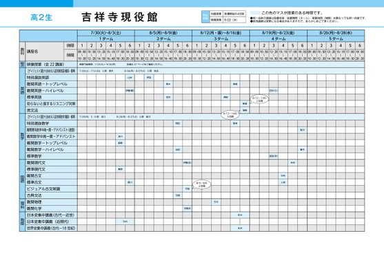 高2生吉祥寺現役館申込期限対面授業受講開始の4日前映像授業8/22(木)この色のマスが授業のある時限です。●同一名称の講座は設置校舎・設置期間(ターム)・授業時間(時限)が異なっても同一内容です。●担当講師は変更になる場合がありますので、あらかじめご了承ください。7/30(火)~8/3(土)8/5(月)~8/9(金)8/12(月・振)〜8/16(金)8/19(月)~8/23(金)8/26(月)~8/28(水)1ターム341256122ターム3456123ターム3456124ターム3456125ターム345609:0010:5013:2015:1017:0018:5009:0010:5013:2015:1017:0018:5009:0010:5013:2015:1017:0018:5009:0010:5013:2015:1017:0018:5009:0010:5013:2015:1017:0018:50〜〜〜〜〜〜〜〜〜〜〜〜〜〜〜〜〜〜10:3012:2014:5016:4018:3020:2010:3012:2014:5016:4018:3020:2010:3012:2014:5016:4018:3020:2010:3012:2014:5016:4018:3020:2010:3012:2014:5016:4018:3020:20〜〜〜〜〜〜〜〜〜〜〜〜視聴可能期間:7/23(火)〜9/30(月)詳細は27ページをご確認ください。7/20(土)・7/21(日)5限青木8/26(月)・8/27(火)5限吉田山本押田伊藤(剛)青木吉田7/29(月)5・6限流川8/26(月)・8/27(火)6限相川流川長野桑原貴川竹内田中(久)8/12・13の2日間青柳濱崎8/12~14の3日間香坂青柳濱崎相川露木高田(宇)木村中村上田早川永井岡田迫田伊藤(武)8/5・6の2日間竹中平賀平賀宇野沢講座名時限時間映像授業(全22講座)【ダイジェスト】夏から始める入試対策英語(難関・標準)特別選抜英語難関英語-トップレベル難関英語-ハイレベル標準英語知らないと損するリスニング対策英文法【ダイジェスト】夏から始める入試対策数学(難関・標準)特別選抜数学難関理系数学中高一貫-アドバンスト(速習)難関数学中高一貫-アドバンスト難関数学-トップレベル難関数学-ハイレベル標準数学難関現代文標準現代文難関古文標準古文ビジュアル古文常識古典文法難関物理難関化学日本史集中講義(古代―近世)日本史集中講義(近現代)世界史集中講義(古代―18世紀)教科総合英語数学国語理科地歴●2024年度/夏期講習/東日本/吉祥寺/高2生/パターン35602024_56_3_340_32_20240329103407.csv/1ページ校了時削除