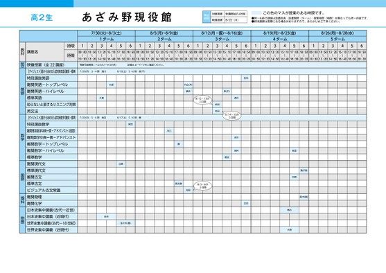 高2生あざみ野現役館申込期限対面授業受講開始の4日前映像授業8/22(木)この色のマスが授業のある時限です。●同一名称の講座は設置校舎・設置期間(ターム)・授業時間(時限)が異なっても同一内容です。●担当講師は変更になる場合がありますので、あらかじめご了承ください。7/30(火)~8/3(土)8/5(月)~8/9(金)8/12(月・振)〜8/16(金)8/19(月)~8/23(金)8/26(月)~8/28(水)1ターム341256122ターム3456123ターム3456124ターム3456125ターム345609:0010:5013:2015:1017:0018:5009:0010:5013:2015:1017:0018:5009:0010:5013:2015:1017:0018:5009:0010:5013:2015:1017:0018:5009:0010:5013:2015:1017:0018:50〜〜〜〜〜〜〜〜〜〜〜〜〜〜〜〜〜〜10:3012:2014:5016:4018:3020:2010:3012:2014:5016:4018:3020:2010:3012:2014:5016:4018:3020:2010:3012:2014:5016:4018:3020:2010:3012:2014:5016:4018:3020:20〜〜〜〜〜〜〜〜〜〜〜〜視聴可能期間:7/23(火)〜9/30(月)詳細は27ページをご確認ください。7/29(月)3・4限清川8/10(土)5・6限森(千)大胡大島内山(洋)鏑木8/12・13の2日間7/29(月)5・6限依田8/17(土)5・6限隣岡田川口隣西大路和田8/5・6の2日間山崎田中佐々木(尊)森(千)清川8/14~16の3日間吉田吉田流川岩村板谷安井臼井依田大野鹿子島鈴木(誠)高杉大野講座名時限時間映像授業(全22講座)【ダイジェスト】夏から始める入試対策英語(難関・標準)特別選抜英語難関英語-トップレベル難関英語-ハイレベル標準英語知らないと損するリスニング対策英文法【ダイジェスト】夏から始める入試対策数学(難関・標準)特別選抜数学難関理系数学中高一貫-アドバンスト(速習)難関数学中高一貫-アドバンスト難関数学-トップレベル難関数学-ハイレベル標準数学難関現代文標準現代文難関古文標準古文ビジュアル古文常識難関物理難関化学日本史集中講義(古代―近世)日本史集中講義(近現代)世界史集中講義(古代―18世紀)世界史集中講義(近現代)教科総合英語数学国語理科地歴●2024年度/夏期講習/東日本/あざみ野/高2生/パターン35602024_56_3_339_32_20240329103407.csv/1ページ校了時削除