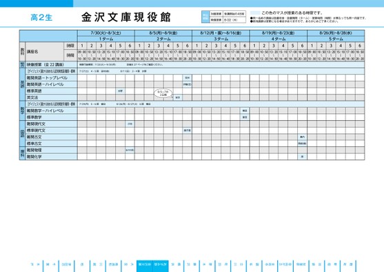 高2生金沢文庫現役館申込期限対面授業受講開始の4日前映像授業8/22(木)この色のマスが授業のある時限です。●同一名称の講座は設置校舎・設置期間(ターム)・授業時間(時限)が異なっても同一内容です。●担当講師は変更になる場合がありますので、あらかじめご了承ください。7/30(火)~8/3(土)8/5(月)~8/9(金)8/12(月・振)〜8/16(金)8/19(月)~8/23(金)8/26(月)~8/28(水)1ターム341256122ターム3456123ターム3456124ターム3456125ターム345609:0010:5013:2015:1017:0018:5009:0010:5013:2015:1017:0018:5009:0010:5013:2015:1017:0018:5009:0010:5013:2015:1017:0018:5009:0010:5013:2015:1017:0018:50〜〜〜〜〜〜〜〜〜〜〜〜〜〜〜〜〜〜〜〜〜〜〜〜〜〜〜〜〜〜10:3012:2014:5016:4018:3020:2010:3012:2014:5016:4018:3020:2010:3012:2014:5016:4018:3020:2010:3012:2014:5016:4018:3020:2010:3012:2014:5016:4018:3020:20視聴可能期間:7/23(火)〜9/30(月)詳細は27ページをご確認ください。7/27(土)4・5限田村(修)8/11(日)3・4限水野水野8/5~7の3日間安井7/29(月)5・6限富田8/26(月)・8/27(火)6限横田小池佐々木(哲)安井伊藤(宏)鹿子島横田富田鹿内阿部(順)原講座名時限時間映像授業(全22講座)【ダイジェスト】夏から始める入試対策英語(難関・標準)難関英語-トップレベル難関英語-ハイレベル標準英語英文法【ダイジェスト】夏から始める入試対策数学(難関・標準)難関数学-ハイレベル標準数学難関現代文標準現代文難関古文標準古文難関物理難関化学教科総合英語数学国語理科●2024年度/夏期講習/東日本/金沢文庫/高2生/パターン3560南浦和津田沼金沢文庫柏2024_56_3_335_32_20240329103407.csv/1ページ自由が丘あざみ野吉祥寺秋葉原厚木町田立川調布横浜藤沢池袋校了時削除新宿麹町水戸千葉川越大宮