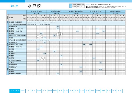 高2生水戸校申込期限対面授業受講開始の4日前映像授業8/22(木)この色のマスが授業のある時限です。●同一名称の講座は設置校舎・設置期間(ターム)・授業時間(時限)が異なっても同一内容です。●担当講師は変更になる場合がありますので、あらかじめご了承ください。7/30(火)~8/3(土)8/5(月)~8/9(金)8/12(月・振)〜8/16(金)8/19(月)~8/23(金)8/26(月)~8/28(水)1ターム341256122ターム3456123ターム3456124ターム3456125ターム345609:1511:0513:3015:2017:1019:0009:1511:0513:3015:2017:1019:0009:1511:0513:3015:2017:1019:0009:1511:0513:3015:2017:1019:0009:1511:0513:3015:2017:1019:00〜〜〜〜〜〜〜〜〜〜〜〜〜〜〜〜〜〜〜〜〜〜〜〜〜〜〜〜〜〜10:4512:3515:0016:5018:4020:3010:4512:3515:0016:5018:4020:3010:4512:3515:0016:5018:4020:3010:4512:3515:0016:5018:4020:3010:4512:3515:0016:5018:4020:30視聴可能期間:7/23(火)〜9/30(月)詳細は27ページをご確認ください。7/29(月)5・6限濱崎8/11(日)5・6限田村(修)森(博)7/30~8/1の3日間森(博)7/29(月)3・4限合田8/17(土)5・6限佐藤亀山亀山合田喜久里7/30・31の2日間上田桜井濱崎8/5~7の3日間濱崎荒田上田小野小野田村(修)岡本田村(修)山川佐藤伊東(鋼)小野小野佐々木(哲)浅利白石講座名時限時間映像授業(全22講座)【ダイジェスト】夏から始める入試対策英語(難関・標準)特別選抜英語難関英語-トップレベル難関英語-ハイレベル標準英語知らないと損する熟語・イディオム英文法【ダイジェスト】夏から始める入試対策数学(難関・標準)特別選抜数学難関数学-トップレベル難関数学-ハイレベル標準数学難関現代文標準現代文難関古文標準古文ビジュアル古文常識古典文法特別選抜物理特別選抜化学難関物理難関化学物理基礎の徹底理解教科総合英語数学国語理科●2024年度/夏期講習/東日本/水戸/高2生/パターン3560南浦和津田沼柏金沢文庫2024_56_3_344_32_20240329103407.csv/1ページ自由が丘あざみ野吉祥寺秋葉原厚木町田立川調布横浜藤沢池袋校了時削除新宿麹町水戸千葉川越大宮