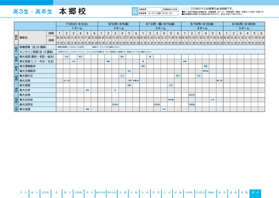 高3生・高卒生本郷校申込期限対面授業受講開始の4日前映像授業・オンライン授業8/22(木)この色のマスが授業のある時限です。●同一名称の講座は設置校舎・設置期間(ターム)・授業時間(時限)が異なっても同一内容です。●担当講師は変更になる場合がありますので、あらかじめご了承ください。7/30(火)~8/3(土)8/5(月)~8/9(金)8/12(月・振)~8/16(金)8/19(月)~8/23(金)8/26(月)~8/28(水)1ターム341256122ターム3456123ターム3456124ターム3456125ターム345609:0010:5013:2015:1017:0018:5009:0010:5013:2015:1017:0018:5009:0010:5013:2015:1017:0018:5009:0010:5013:2015:1017:0018:5009:0010:5013:2015:1017:0018:50〜〜〜〜〜〜〜〜〜〜〜〜〜〜〜〜〜〜〜〜〜〜〜〜〜〜〜〜〜〜10:3012:2014:5016:4018:3020:2010:3012:2014:5016:4018:3020:2010:3012:2014:5016:4018:3020:2010:3012:2014:5016:4018:3020:2010:3012:2014:5016:4018:3020:20視聴可能期間:7/23(火)〜9/30(月)詳細は3・4ページをご確認ください。ご自宅でタブレットやスマートフォン、パソコンなどで受講する「ライブ配信型」の授業です。詳細は5ページをご確認ください。丹羽高沢久恒瀬﨑太田・三森墺墺香坂高沢立川刈谷大野・髙橋(佳)加藤浅利伊藤金坂本(新)新野岡田伊東(敦)菊川三河木村坂本(勝)坂本(新)中井向井(亮)平尾(雅)藤澤・西川山中講座名時限時間映像授業(全55講座)オンライン授業(全14講座)東大英語(要約・和訳・総合)東大英語(LC・作文・文法)東大理類数学東大文類数学東大現代文東大古典東大物理東大化学東大生物東大日本史東大世界史東大地理教科総合英語数学国語理科地歴・公民●2024年度/夏期講習/東日本/本郷校/高3・卒生/パターン3560金沢文庫南浦和津田沼柏あざみ野2024_56_3_317_11_20240404164029.csv/1ページ自由が丘秋葉原吉祥寺厚木町田立川調布水戸千葉横浜藤沢川越大宮池袋校了時削除新宿麹町本郷