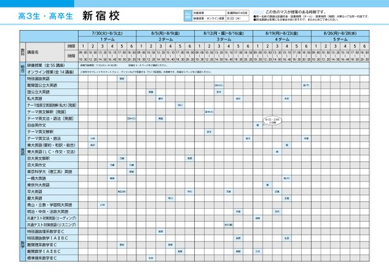 高3生・高卒生新宿校申込期限対面授業受講開始の4日前映像授業・オンライン授業8/22(木)この色のマスが授業のある時限です。●同一名称の講座は設置校舎・設置期間(ターム)・授業時間(時限)が異なっても同一内容です。●担当講師は変更になる場合がありますので、あらかじめご了承ください。7/30(火)~8/3(土)8/5(月)~8/9(金)8/12(月・振)~8/16(金)8/19(月)~8/23(金)8/26(月)~8/28(水)1ターム341256122ターム3456123ターム3456124ターム3456125ターム345609:0010:5013:2015:1017:0018:5009:0010:5013:2015:1017:0018:5009:0010:5013:2015:1017:0018:5009:0010:5013:2015:1017:0018:5009:0010:5013:2015:1017:0018:50〜〜〜〜〜〜〜〜〜〜〜〜〜〜〜〜〜〜10:3012:2014:5016:4018:3020:2010:3012:2014:5016:4018:3020:2010:3012:2014:5016:4018:3020:2010:3012:2014:5016:4018:3020:2010:3012:2014:5016:4018:3020:20〜〜〜〜〜〜〜〜〜〜〜〜視聴可能期間:7/23(火)〜9/30(月)詳細は3・4ページをご確認ください。ご自宅でタブレットやスマートフォン、パソコンなどで受講する「ライブ配信型」の授業です。詳細は5ページをご確認ください。青柳奥脇護守奥脇早川田中(久)小林高沢刀刀奥脇刀青柳田中(久)赤木田中(久)赤木森(千)成川矢作8/22・23の2日間幅成川中園墺墺新野柴田(卓)早川天倉小林早川香坂長野古谷長野長野吉川(量)天倉長野秦野岩間三木墺近嵐矢作森(千)近嵐生田講座名時限時間映像授業(全55講座)オンライン授業(全14講座)特別選抜英語難関国公立大英語国公立大英語私大英語テーマ超長文英語読解(私大)発展]テーマ英文解釈[発展]テーマ英文法・語法[発展]自由英作文テーマ英文解釈テーマ英文法・語法東大英語(要約・和訳・総合)東大英語(LC・作文・文法)京大英文解釈京大英作文東京科学大(理工系)英語一橋大英語東京外大英語早大英語慶大英語青山・立教・学習院大英語明治・中央・法政大英語共通テスト対策英語(リーディング)共通テスト対策英語(リスニング)特別選抜理系数学ⅢC特別選抜数学ⅠAⅡBC難関理系数学ⅢC難関数学ⅠAⅡBC標準理系数学ⅢC教科総合英語数学●2024年度/夏期講習/東日本/新宿/高3・卒生/パターン35602024_56_3_329_11_20240329103251.csv/1ページ校了時削除