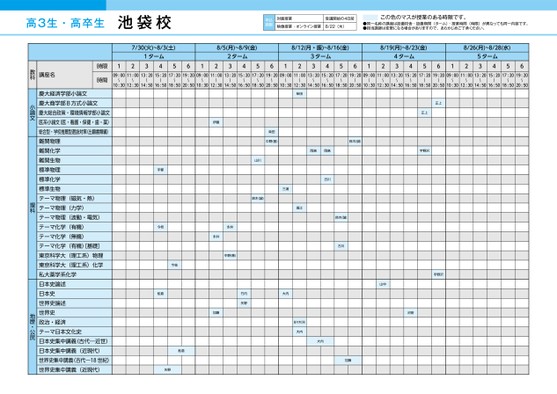 高3生・高卒生池袋校申込期限対面授業受講開始の4日前映像授業・オンライン授業8/22(木)この色のマスが授業のある時限です。●同一名称の講座は設置校舎・設置期間(ターム)・授業時間(時限)が異なっても同一内容です。●担当講師は変更になる場合がありますので、あらかじめご了承ください。7/30(火)~8/3(土)8/5(月)~8/9(金)8/12(月・振)~8/16(金)8/19(月)~8/23(金)8/26(月)~8/28(水)1ターム341256122ターム3456123ターム3456124ターム3456125ターム345609:0011:0013:2015:2017:2019:2009:0011:0013:2015:2017:2019:2009:0011:0013:2015:2017:2019:2009:0011:0013:2015:2017:2019:2009:0011:0013:2015:2017:2019:20〜〜〜〜〜〜〜〜〜〜〜〜〜〜〜〜〜〜10:3012:3014:5016:5018:5020:5010:3012:3014:5016:5018:5020:5010:3012:3014:5016:5018:5020:5010:3012:3014:5016:5018:5020:5010:3012:3014:5016:5018:5020:50〜〜〜〜〜〜〜〜〜〜〜〜柴田正上正上鈴木(誠)岡島岡島宇野沢古川三浦堀江鈴木(誠)古川柴田中野(喜)山川鈴木(誠)伊藤永井永井中野(喜)竹内矢野大内加藤沼田宇野沢山中佐々木(洋)大内大内加藤宇都今枝舩倉今枝舩倉矢野講座名時限時間慶大経済学部小論文慶大商学部B方式小論文慶大総合政策・環境情報学部小論文医系小論文(医・看護・保健・歯・薬)総合型・学校推薦型選抜対策(出願書類編)難関物理難関化学難関生物標準物理標準化学標準生物テーマ物理(磁気・熱)テーマ物理(力学)テーマ物理(波動・電気)テーマ化学(有機)テーマ化学(無機)テーマ化学(有機)基礎]東京科学大(理工系)物理東京科学大(理工系)化学私大薬学系化学日本史論述日本史世界史論述世界史政治・経済テーマ日本文化史日本史集中講義(古代―近世)日本史集中講義(近現代)世界史集中講義(古代―18世紀)世界史集中講義(近現代)教科小論文理科地歴・公民●2024年度/夏期講習/東日本/池袋/高3・卒生/パターン35602024_56_3_314_11_20240329103251.csv/3ページ校了時削除