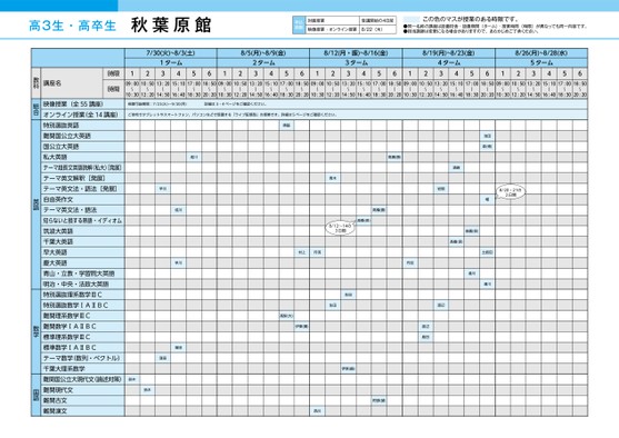 高3生・高卒生秋葉原館申込期限対面授業受講開始の4日前映像授業・オンライン授業8/22(木)この色のマスが授業のある時限です。●同一名称の講座は設置校舎・設置期間(ターム)・授業時間(時限)が異なっても同一内容です。●担当講師は変更になる場合がありますので、あらかじめご了承ください。7/30(火)~8/3(土)8/5(月)~8/9(金)8/12(月・振)~8/16(金)8/19(月)~8/23(金)8/26(月)~8/28(水)1ターム341256122ターム3456123ターム3456124ターム3456125ターム345609:0010:5013:2015:1017:0018:5009:0010:5013:2015:1017:0018:5009:0010:5013:2015:1017:0018:5009:0010:5013:2015:1017:0018:5009:0010:5013:2015:1017:0018:50〜〜〜〜〜〜〜〜〜〜〜〜〜〜〜〜〜〜10:3012:2014:5016:4018:3020:2010:3012:2014:5016:4018:3020:2010:3012:2014:5016:4018:3020:2010:3012:2014:5016:4018:3020:2010:3012:2014:5016:4018:3020:20〜〜〜〜〜〜〜〜〜〜〜〜視聴可能期間:7/23(火)〜9/30(月)詳細は3・4ページをご確認ください。ご自宅でタブレットやスマートフォン、パソコンなどで受講する「ライブ配信型」の授業です。詳細は5ページをご確認ください。奥脇成川高橋(勝)早川成川早川窪田窪田鈴木鈴木青木高橋(勝)髙橋(保)8/12~14の3日間村上丹羽丹羽高梨(大)伊東(鋼)生田生田伊東(鋼)阿部(誠)西川池田森(博)濱崎岩間8/20・21の2日間幅髙橋(保)髙橋(保)土岐田清川清川渡辺渡辺島田講座名時限時間映像授業(全55講座)オンライン授業(全14講座)特別選抜英語難関国公立大英語国公立大英語私大英語テーマ超長文英語読解(私大)発展]テーマ英文解釈[発展]テーマ英文法・語法[発展]自由英作文テーマ英文法・語法知らないと損する熟語・イディオム筑波大英語千葉大英語早大英語慶大英語青山・立教・学習院大英語明治・中央・法政大英語特別選抜理系数学ⅢC特別選抜数学ⅠAⅡBC難関理系数学ⅢC難関数学ⅠAⅡBC標準理系数学ⅢC標準数学ⅠAⅡBCテーマ数学(数列・ベクトル)千葉大理系数学難関国公立大現代文(論述対策)難関現代文難関古文難関漢文教科総合英語数学国語●2024年度/夏期講習/東日本/秋葉原/高3・卒生/パターン35602024_56_3_368_11_20240329103251.csv/1ページ校了時削除