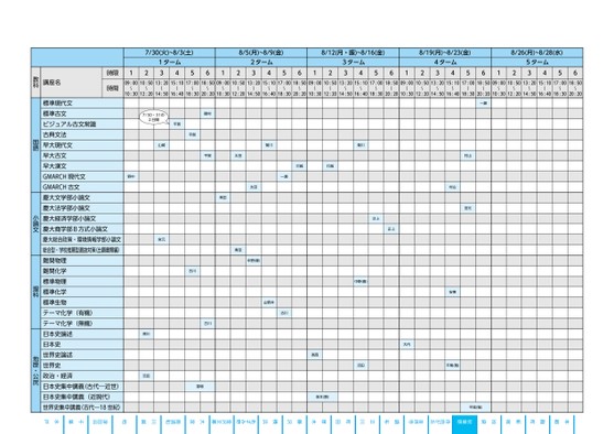 高3生・高卒生申込期限対面授業受講開始の4日前映像授業・オンライン授業8/22(木)この色のマスが授業のある時限です。●同一名称の講座は設置校舎・設置期間(ターム)・授業時間(時限)が異なっても同一内容です。●担当講師は変更になる場合がありますので、あらかじめご了承ください。7/30(火)~8/3(土)8/5(月)~8/9(金)8/12(月・振)~8/16(金)8/19(月)~8/23(金)8/26(月)~8/28(水)1ターム341256122ターム3456123ターム3456124ターム3456125ターム345609:0010:5013:2015:1017:0018:5009:0010:5013:2015:1017:0018:5009:0010:5013:2015:1017:0018:5009:0010:5013:2015:1017:0018:5009:0010:5013:2015:1017:0018:50〜〜〜〜〜〜〜〜〜〜〜〜〜〜〜〜〜〜〜〜〜〜〜〜〜〜〜〜〜〜10:3012:2014:5016:4018:3020:2010:3012:2014:5016:4018:3020:2010:3012:2014:5016:4018:3020:2010:3012:2014:5016:4018:3020:2010:3012:2014:5016:4018:3020:20時限時間講座名教科標準現代文標準古文ビジュアル古文常識古典文法早大現代文早大古文早大漢文GMARCH現代文GMARCH古文慶大文学部小論文慶大法学部小論文慶大経済学部小論文慶大商学部B方式小論文慶大総合政策・環境情報学部小論文総合型・学校推薦型選抜対策(出願書類編)難関物理難関化学標準物理標準化学標準生物テーマ化学(有機)テーマ化学(無機)日本史論述日本史世界史論述世界史政治・経済日本史集中講義(古代―近世)日本史集中講義(近現代)世界史集中講義(古代―18世紀)国語小論文理科地歴・公民磯村平賀平賀7/30・31の2日間山崎菊川菊川野中平賀太田打越打越一瀬太田青田宮元古川青田中野(健)山野井古川黒川吉田古川富増一瀬村山宮元村山安東正上正上中野(喜)大内沼田平尾(雅)髙岡坂本(勝)平尾(雅)●2024年度/夏期講習/東日本/秋葉原/高3・卒生/パターン3560金沢文庫南浦和津田沼柏あざみ野2024_56_3_368_11_20240329103251.csv/2ページ自由が丘秋葉原吉祥寺厚木町田立川調布水戸千葉横浜藤沢川越大宮池袋校了時削除新宿麹町本郷