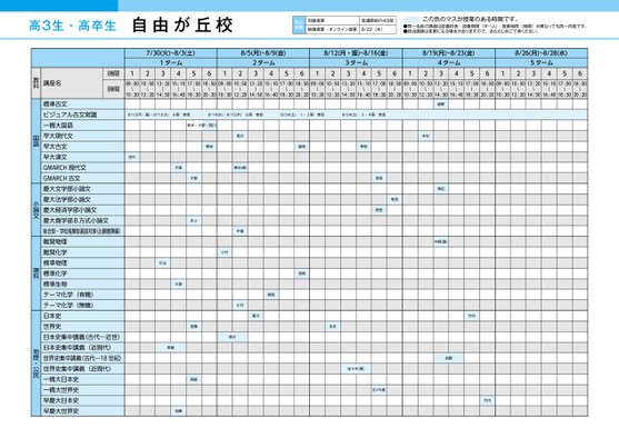 高3生・高卒生自由が丘校申込期限対面授業受講開始の4日前映像授業・オンライン授業8/22(木)この色のマスが授業のある時限です。●同一名称の講座は設置校舎・設置期間(ターム)・授業時間(時限)が異なっても同一内容です。●担当講師は変更になる場合がありますので、あらかじめご了承ください。7/30(火)~8/3(土)8/5(月)~8/9(金)8/12(月・振)~8/16(金)8/19(月)~8/23(金)8/26(月)~8/28(水)1ターム341256122ターム3456123ターム3456124ターム3456125ターム345609:0010:5013:2015:1017:0018:5009:0010:5013:2015:1017:0018:5009:0010:5013:2015:1017:0018:5009:0010:5013:2015:1017:0018:5009:0010:5013:2015:1017:0018:50〜〜〜〜〜〜〜〜〜〜〜〜〜〜〜〜〜〜10:3012:2014:5016:4018:3020:2010:3012:2014:5016:4018:3020:2010:3012:2014:5016:4018:3020:2010:3012:2014:5016:4018:3020:2010:3012:2014:5016:4018:3020:20〜〜〜〜〜〜〜〜〜〜〜〜8/12(月・振)・8/13(火)6限隼坂8/14(水)・8/15(木)6限隼坂8/24(土)1・2限隼坂8/24(土)3・4限隼坂新井・大野・西川菊川隼坂脇坂隼坂田中大窪清水(直)中塚小竹西尾永井西尾小竹黒川黒川大野正上加藤森脇杉山三浦森脇加藤木村越野青田中野(喜)隼坂飛田飛田竹内加藤竹内佐々木(尊)佐々木(尊)●2024年度/夏期講習/東日本/自由が丘/高3・卒生/パターン35602024_56_3_337_11_20240329103251.csv/2ページ校了時削除時限時間講座名教科標準古文ビジュアル古文常識一橋大国語早大現代文早大古文早大漢文GMARCH現代文GMARCH古文慶大文学部小論文慶大法学部小論文慶大経済学部小論文慶大商学部B方式小論文総合型・学校推薦型選抜対策(出願書類編)難関物理難関化学標準物理標準化学標準生物テーマ化学(有機)テーマ化学(無機)日本史世界史日本史集中講義(古代―近世)日本史集中講義(近現代)世界史集中講義(古代―18世紀)世界史集中講義(近現代)一橋大日本史一橋大世界史早慶大日本史早慶大世界史国語小論文理科地歴・公民
