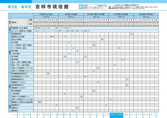高3生・高卒生吉祥寺現役館申込期限対面授業受講開始の4日前映像授業・オンライン授業8/22(木)この色のマスが授業のある時限です。●同一名称の講座は設置校舎・設置期間(ターム)・授業時間(時限)が異なっても同一内容です。●担当講師は変更になる場合がありますので、あらかじめご了承ください。7/30(火)~8/3(土)8/5(月)~8/9(金)8/12(月・振)~8/16(金)8/19(月)~8/23(金)8/26(月)~8/28(水)1ターム341256122ターム3456123ターム3456124ターム3456125ターム345609:0010:5013:2015:1017:0018:5009:0010:5013:2015:1017:0018:5009:0010:5013:2015:1017:0018:5009:0010:5013:2015:1017:0018:5009:0010:5013:2015:1017:0018:50〜〜〜〜〜〜〜〜〜〜〜〜〜〜〜〜〜〜〜〜〜〜〜〜〜〜〜〜〜〜10:3012:2014:5016:4018:3020:2010:3012:2014:5016:4018:3020:2010:3012:2014:5016:4018:3020:2010:3012:2014:5016:4018:3020:2010:3012:2014:5016:4018:3020:20視聴可能期間:7/23(火)〜9/30(月)詳細は3・4ページをご確認ください。ご自宅でタブレットやスマートフォン、パソコンなどで受講する「ライブ配信型」の授業です。詳細は5ページをご確認ください。伊藤(剛)吉田濱崎矢作青柳矢作吉田青木小林墺二本柳矢作小林尾崎内山(洋)田中(久)青柳濱崎長野渡辺高梨(大)渡辺香坂伊藤(武)軽部渡辺岡田吉澤宮本香坂古谷古谷絵川久地竹内露木講座名時限時間映像授業(全55講座)オンライン授業(全14講座)特別選抜英語難関国公立大英語国公立大英語私大英語テーマ英文法・語法[発展]テーマ英文法・語法東大英語一橋大英語早大英語慶大英語青山・立教・学習院大英語明治・中央・法政大英語共通テスト対策英語(リーディング)共通テスト対策英語(リスニング)特別選抜理系数学ⅢC特別選抜数学ⅠAⅡBC難関理系数学ⅢC難関数学ⅠAⅡBC標準理系数学ⅢC標準数学ⅠAⅡBC東大理類数学一橋大数学共通テスト対策数学IA共通テスト対策数学(ⅡB+ベクトル型)難関国公立大現代文(論述対策)難関現代文難関古文難関漢文教科総合英語数学国語●2024年度/夏期講習/東日本/吉祥寺/高3・卒生/パターン3560金沢文庫南浦和津田沼柏あざみ野2024_56_3_340_11_20240329103251.csv/1ページ自由が丘秋葉原吉祥寺厚木町田立川調布水戸千葉横浜藤沢川越大宮池袋校了時削除新宿麹町本郷