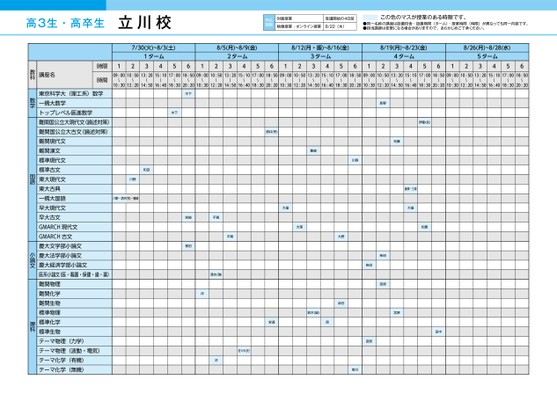 高3生・高卒生立川校申込期限対面授業受講開始の4日前映像授業・オンライン授業8/22(木)この色のマスが授業のある時限です。●同一名称の講座は設置校舎・設置期間(ターム)・授業時間(時限)が異なっても同一内容です。●担当講師は変更になる場合がありますので、あらかじめご了承ください。7/30(火)~8/3(土)8/5(月)~8/9(金)8/12(月・振)~8/16(金)8/19(月)~8/23(金)8/26(月)~8/28(水)1ターム341256122ターム3456123ターム3456124ターム3456125ターム345609:0010:5013:2015:1017:0018:5009:0010:5013:2015:1017:0018:5009:0010:5013:2015:1017:0018:5009:0010:5013:2015:1017:0018:5009:0010:5013:2015:1017:0018:50〜〜〜〜〜〜〜〜〜〜〜〜〜〜〜〜〜〜10:3012:2014:5016:4018:3020:2010:3012:2014:5016:4018:3020:2010:3012:2014:5016:4018:3020:2010:3012:2014:5016:4018:3020:2010:3012:2014:5016:4018:3020:20〜〜〜〜〜〜〜〜〜〜〜〜木下木下和田川野川野・酒井(完)・豊崎宮崎平賀平賀青田清水(瑞)沖酒井(完)豊崎川野大窪大窪長野伊藤(武)松藤藤澤・三森大窪松藤大野染谷柴田柴田宮原安達鈴木(誠)原宮原田中佐々木(史)沖宮原菊川講座名時限時間東京科学大(理工系)数学一橋大数学トップレベル医進数学難関国公立大現代文(論述対策)難関国公立大古文(論述対策)難関現代文難関漢文標準現代文標準古文東大現代文東大古典一橋大国語早大現代文早大古文GMARCH現代文GMARCH古文慶大文学部小論文慶大法学部小論文慶大経済学部小論文医系小論文(医・看護・保健・歯・薬)難関物理難関化学難関生物標準物理標準化学標準生物テーマ物理(力学)テーマ物理(波動・電気)テーマ化学(有機)テーマ化学(無機)教科数学国語小論文理科●2024年度/夏期講習/東日本/立川/高3・卒生/パターン35602024_56_3_315_11_20240329103251.csv/2ページ校了時削除
