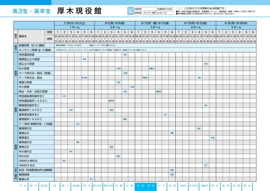 高3生・高卒生厚木現役館申込期限対面授業受講開始の4日前映像授業・オンライン授業8/22(木)この色のマスが授業のある時限です。●同一名称の講座は設置校舎・設置期間(ターム)・授業時間(時限)が異なっても同一内容です。●担当講師は変更になる場合がありますので、あらかじめご了承ください。7/30(火)~8/3(土)8/5(月)~8/9(金)8/12(月・振)~8/16(金)8/19(月)~8/23(金)8/26(月)~8/28(水)1ターム341256122ターム3456123ターム3456124ターム3456125ターム345609:0010:5013:2015:1017:0018:5009:0010:5013:2015:1017:0018:5009:0010:5013:2015:1017:0018:5009:0010:5013:2015:1017:0018:5009:0010:5013:2015:1017:0018:50〜〜〜〜〜〜〜〜〜〜〜〜〜〜〜〜〜〜〜〜〜〜〜〜〜〜〜〜〜〜10:3012:2014:5016:4018:3020:2010:3012:2014:5016:4018:3020:2010:3012:2014:5016:4018:3020:2010:3012:2014:5016:4018:3020:2010:3012:2014:5016:4018:3020:20視聴可能期間:7/23(火)〜9/30(月)詳細は3・4ページをご確認ください。ご自宅でタブレットやスマートフォン、パソコンなどで受講する「ライブ配信型」の授業です。詳細は5ページをご確認ください。安井吉川(幸)大胡二本柳二本柳大胡伊藤(宏)伊藤(宏)二本柳大島伊藤(宏)高田(宇)富田渡部渡部中谷村本森永森永村本飯田早川堀尾古谷越野藤巻矢野犬塚絵川犬塚岩村山下打越講座名時限時間映像授業(全55講座)オンライン授業(全14講座)特別選抜英語難関国公立大英語国公立大英語私大英語テーマ英文法・語法[発展]テーマ英文法・語法横国大英語早大英語明治・中央・法政大英語特別選抜理系数学ⅢC特別選抜数学ⅠAⅡBC難関理系数学ⅢC難関数学ⅠAⅡBC標準理系数学ⅢC標準数学ⅠAⅡBCテーマ数学(複素数平面・2次曲線)難関現代文難関古文難関漢文標準現代文標準古文早大現代文早大古文GMARCH現代文GMARCH古文総合型・学校推薦型選抜対策(出願書類編)難関物理難関化学教科総合英語数学国語小論文理科●2024年度/夏期講習/東日本/厚木/高3・卒生/パターン3560金沢文庫南浦和津田沼柏あざみ野2024_56_3_332_11_20240329103251.csv/1ページ自由が丘秋葉原吉祥寺厚木町田立川調布水戸千葉川越大宮横浜藤沢池袋校了時削除新宿麹町本郷
