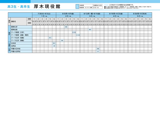 高3生・高卒生厚木現役館申込期限対面授業受講開始の4日前映像授業・オンライン授業8/22(木)この色のマスが授業のある時限です。●同一名称の講座は設置校舎・設置期間(ターム)・授業時間(時限)が異なっても同一内容です。●担当講師は変更になる場合がありますので、あらかじめご了承ください。7/30(火)~8/3(土)8/5(月)~8/9(金)8/12(月・振)~8/16(金)8/19(月)~8/23(金)8/26(月)~8/28(水)1ターム341256122ターム3456123ターム3456124ターム3456125ターム345609:0010:5013:2015:1017:0018:5009:0010:5013:2015:1017:0018:5009:0010:5013:2015:1017:0018:5009:0010:5013:2015:1017:0018:5009:0010:5013:2015:1017:0018:50〜〜〜〜〜〜〜〜〜〜〜〜〜〜〜〜〜〜10:3012:2014:5016:4018:3020:2010:3012:2014:5016:4018:3020:2010:3012:2014:5016:4018:3020:2010:3012:2014:5016:4018:3020:2010:3012:2014:5016:4018:3020:20〜〜〜〜〜〜〜〜〜〜〜〜安達倉田佐々木(康)佐々木(康)早川黒川大野安達森脇山口時限時間講座名教科標準化学標準生物テーマ物理(力学)テーマ物理(波動・電気)テーマ化学(有機)テーマ化学(無機)日本史世界史早慶大日本史早慶大世界史理科地歴・公民●2024年度/夏期講習/東日本/厚木/高3・卒生/パターン35602024_56_3_332_11_20240329103251.csv/2ページ校了時削除