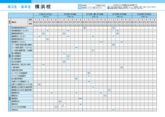 高3生・高卒生横浜校申込期限対面授業受講開始の4日前映像授業・オンライン授業8/22(木)この色のマスが授業のある時限です。●同一名称の講座は設置校舎・設置期間(ターム)・授業時間(時限)が異なっても同一内容です。●担当講師は変更になる場合がありますので、あらかじめご了承ください。7/30(火)~8/3(土)8/5(月)~8/9(金)8/12(月・振)~8/16(金)8/19(月)~8/23(金)8/26(月)~8/28(水)1ターム341256122ターム3456123ターム3456124ターム3456125ターム345609:0011:0013:2015:2017:2019:2009:0011:0013:2015:2017:2019:2009:0011:0013:2015:2017:2019:2009:0011:0013:2015:2017:2019:2009:0011:0013:2015:2017:2019:20〜〜〜〜〜〜〜〜〜〜〜〜〜〜〜〜〜〜10:3012:3014:5016:5018:5020:5010:3012:3014:5016:5018:5020:5010:3012:3014:5016:5018:5020:5010:3012:3014:5016:5018:5020:5010:3012:3014:5016:5018:5020:50〜〜〜〜〜〜〜〜〜〜〜〜板谷生田板谷渋谷吉崎吉崎渋谷堺依田生田依田迫田板谷板谷森永森永8/2・3の2日間上田須藤吉崎隣小林須藤隣吉崎吉崎瀬谷木村伊藤(恭)渡部横田堀尾依田隣堀尾佐々木(吾)堀尾横田佐河菱山村山佐河時限時間講座名教科特別選抜理系数学ⅢC特別選抜数学ⅠAⅡBC難関理系数学ⅢC難関数学ⅠAⅡBC標準理系数学ⅢC標準数学ⅠAⅡBCテーマ数学(場合の数と確率)テーマ数学(数列・ベクトル)テーマ数学(複素数平面・2次曲線)東大理類数学東大文類数学京大理系数学京大文系数学東京科学大(理工系)数学一橋大数学早慶大理工数学トップレベル医進数学ハイレベル医進数学私大薬学系数学共通テスト対策数学IA共通テスト対策数学(ⅡB+ベクトル型)難関国公立大現代文(論述対策)難関国公立大古文(論述対策)難関現代文難関古文難関漢文標準現代文標準古文ビジュアル古文常識古典文法数学国語●2024年度/夏期講習/東日本/横浜/高3・卒生/パターン35602024_56_3_321_11_20240329103251.csv/2ページ校了時削除